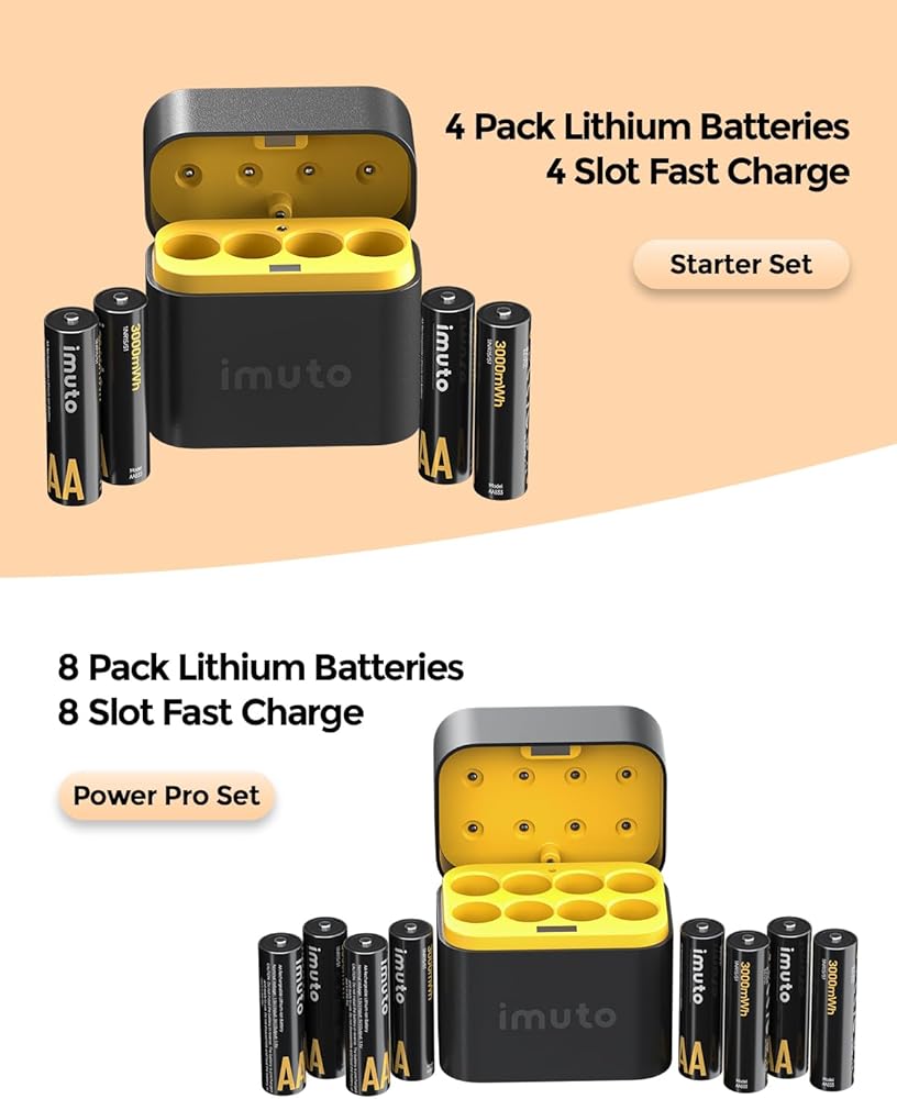 【AA LITHIUM BATTERY FAST CHARGING CASE】imuto double A rechargeable lithium batteries with charger set includes 8 batteries and a fast charging case. The charging case can fully charge 1-8 batteries with a capacity of 3000 mWh in about 2.5 hours, which is 40% more efficient than NiMH batteries. (Please use 5V/3A adapter for quick charging)