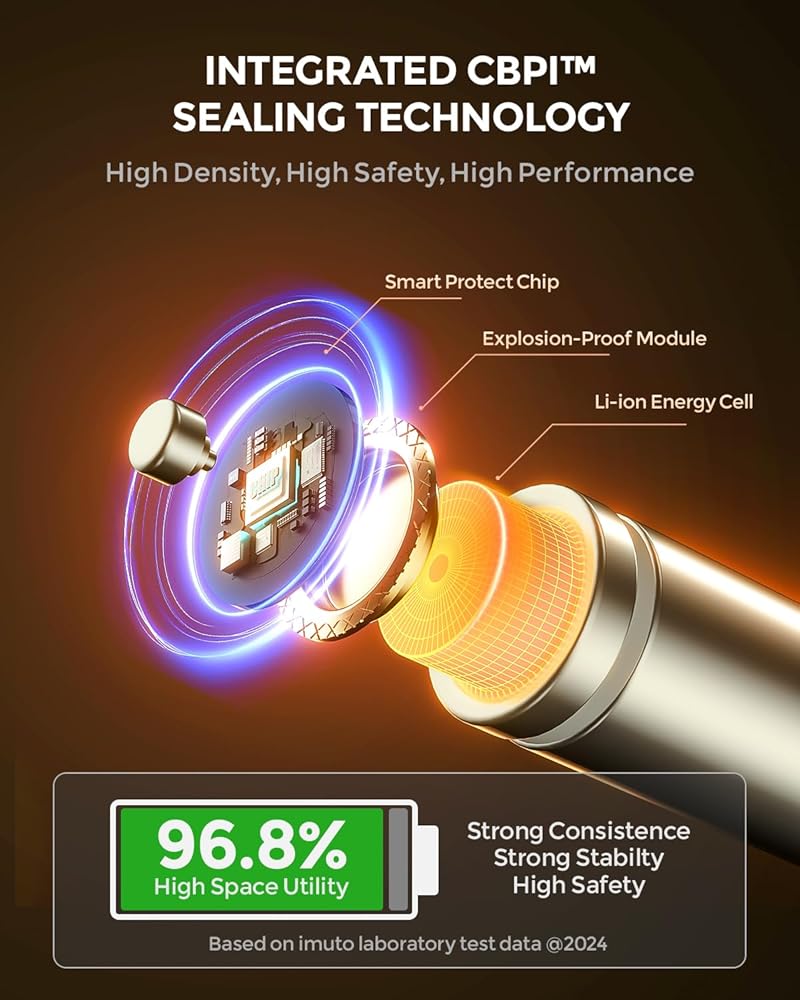 【CBPI SEALING TECHNOLOGY】imuto rechargeable AA lithium batteries adopts self-developed CBPI sealing technology, which has excellent leak-proof performance and improves battery space utilization by 15%. The battery material fully considers the environmental and user safety, and does not contain harmful substances such as lead, mercury and cadmium.