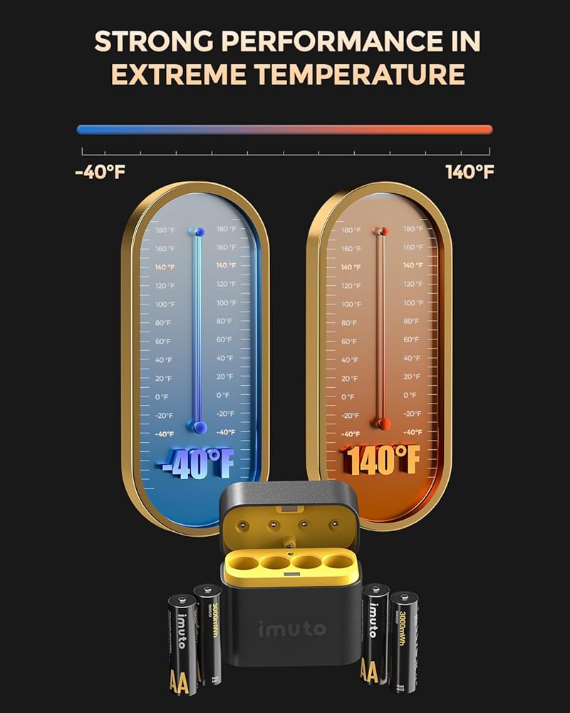 【EXCELLENT TEMPERATURE ADAPTABILITY】imuto rechargeable double A lithium batteries can operate reliably in a wide temperature range of -40°F to 140°F and their performance is far superior to alkaline batteries and NiMH batteries.