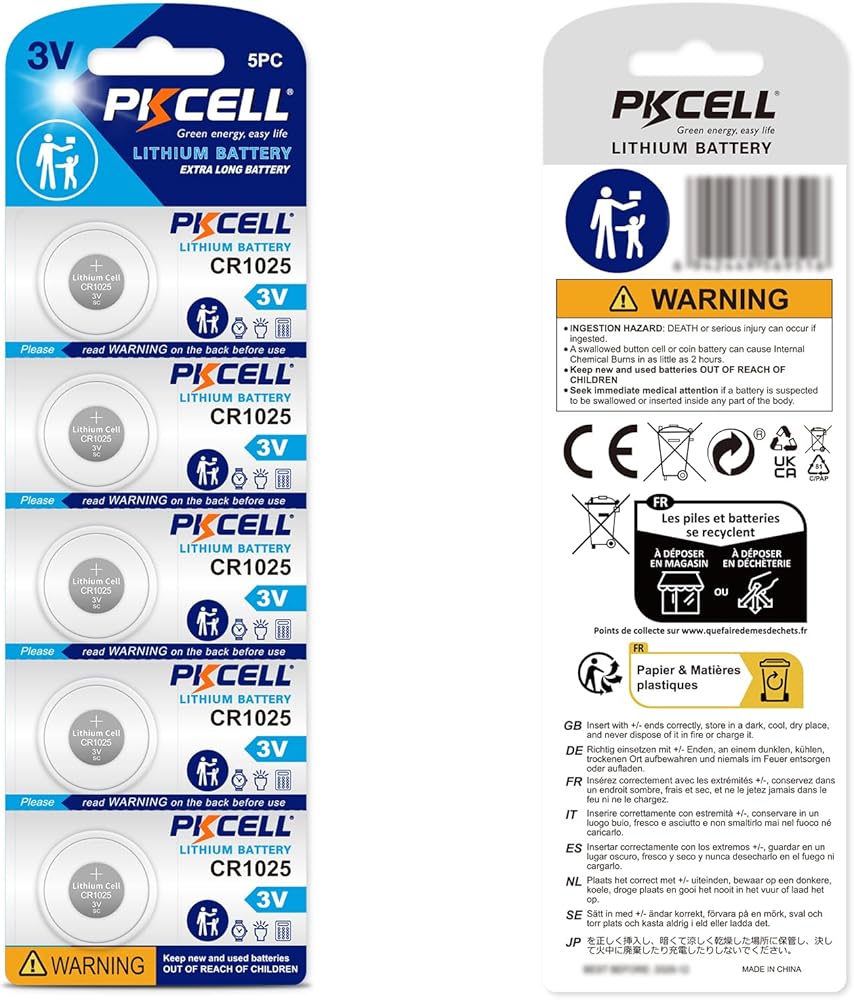 PKCELL 5-Pack CR1025 Lithium Battery 3V CR 1025 Battery, 5-Year Shelf Life