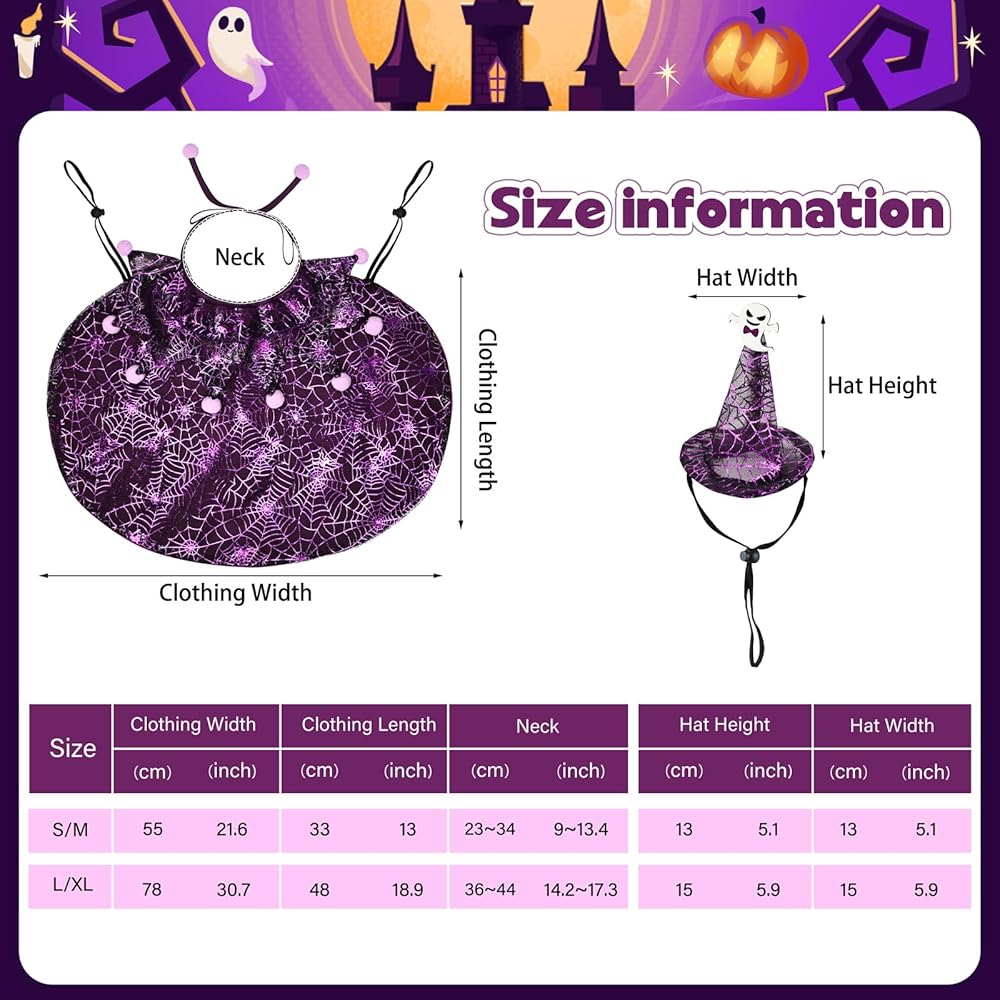 Package Included: This pet costume includes 1pc purple spiderweb mesh cape and 1pc purple hat, perfect for dogs and cats, there are two sizes to choose from, follow the size chart to choose the right size for your pet.