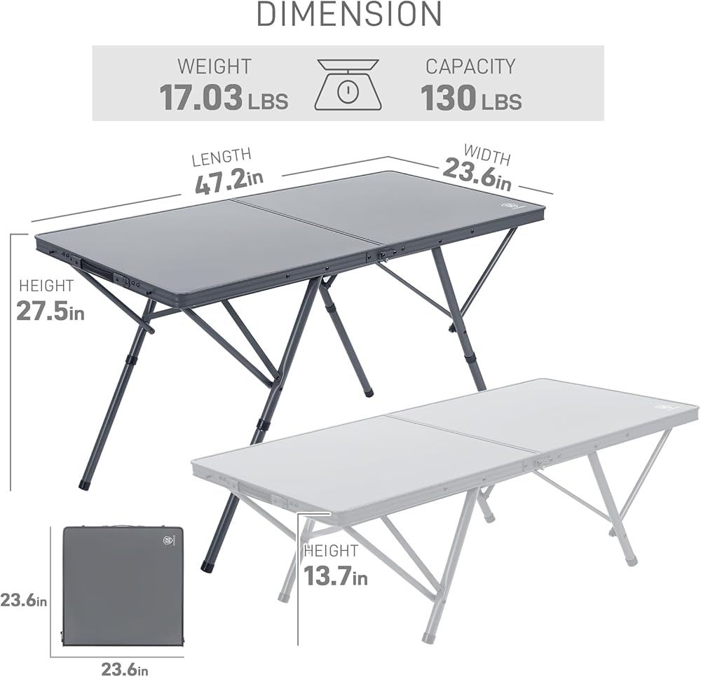 𝐂𝐎𝐌𝐏𝐀𝐂𝐓 𝐒𝐈𝐙𝐄: Open dimensions are 45.9"L x 29.1"W x 29.1"H, folded dimensions are 28.0"L x7.9"W x 5.4"H; the weight of the foldable camping table is 17.9 pounds and it can support up to 110 lbs