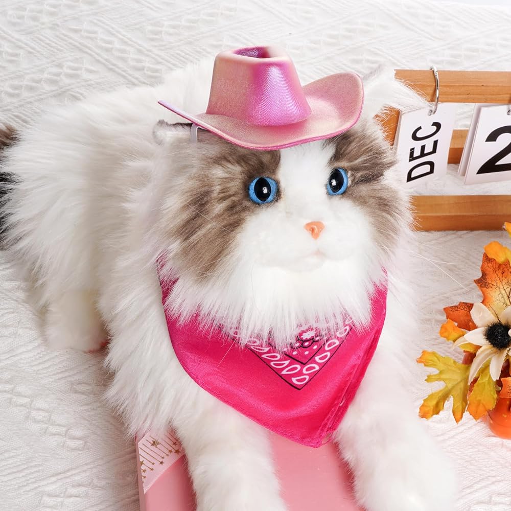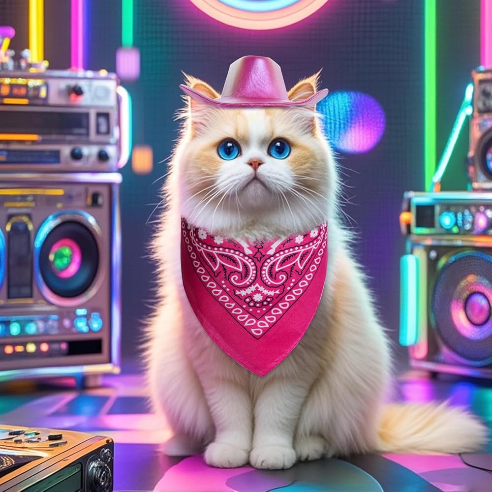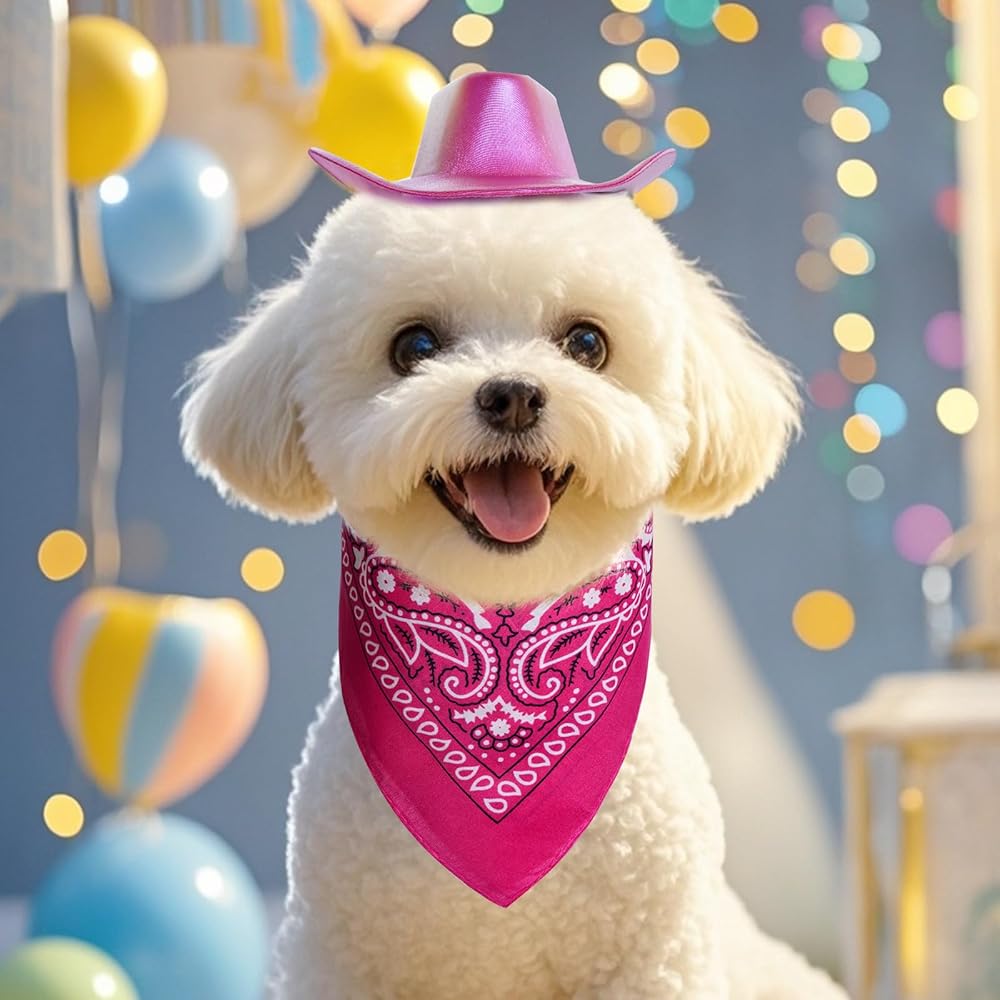 The pet cowboy hat is made of polyester, which can use for a long time,not easily damaged,comfortable for wearing. bandanas is made of cotton fabric which is soft and skin friendly, the retro printing style makes pets looks cool, stand out from the crowd.