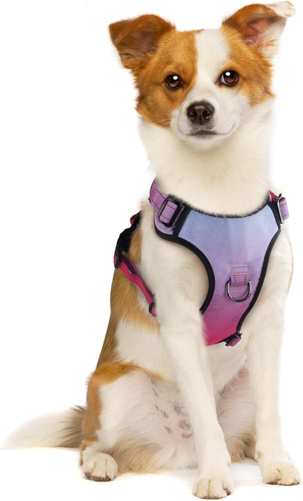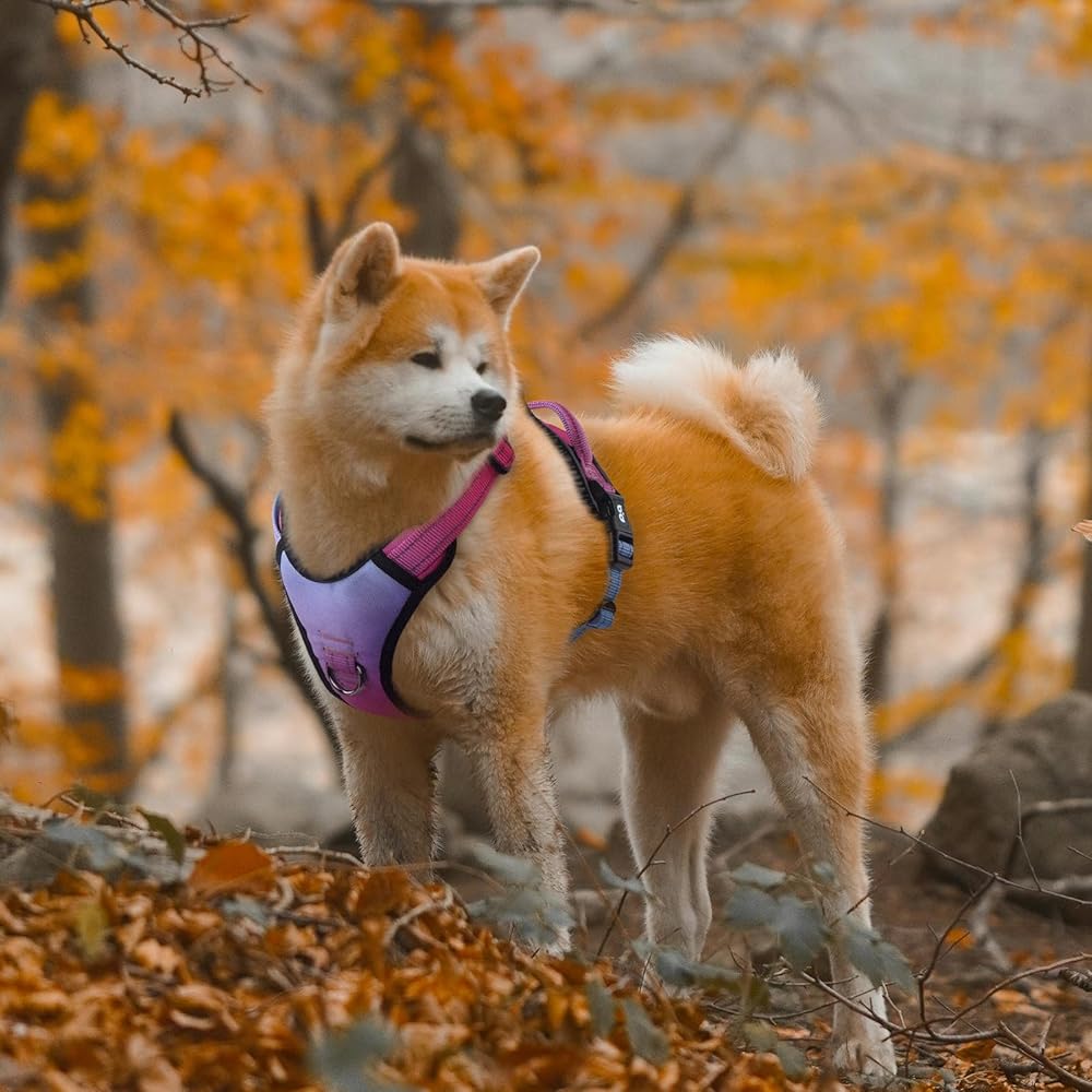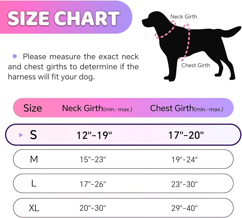 Easy to Use, Fully Adjustable: The dog harness with simple design and quick snap buckles which make it easy to put on and take off. This harness features 12 easy size adjustors at neck and chest for easy adjusting to fit your dog perfectly, even with some room of growth.