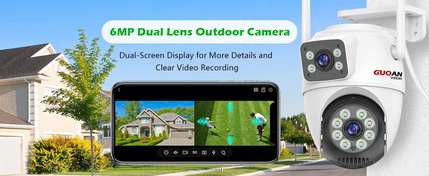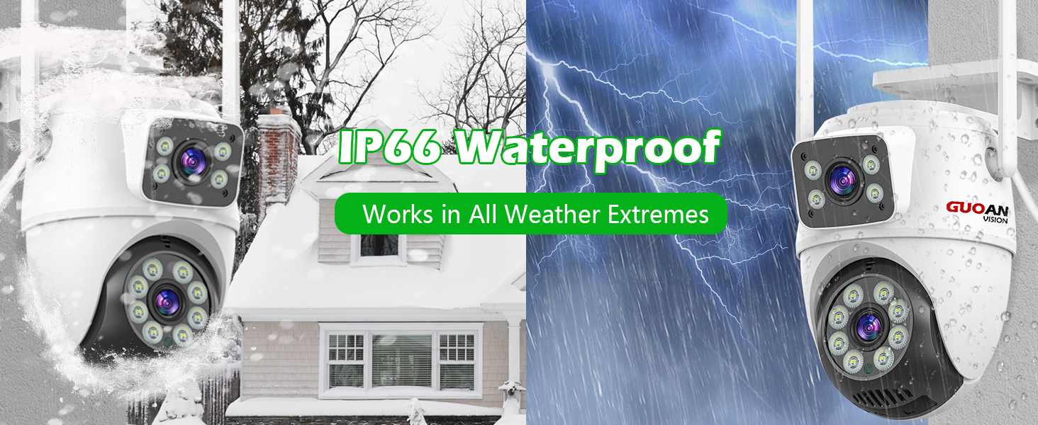 【Dual Lens 360° View & Waterproof 】 GUOANVISION security camera wireless outdoor displays 2 screen on phone simultaniously, one shows wider panoramic monitoring and another shows pan 360°/Tilt 90° rotation and zoom. IP66 waterproof outdoor cameras is use for extreme weather conditions of outside, guarding your home in all seasons. "Wireless" means wireless wifi connect or NVR, Not 100% Free cord.