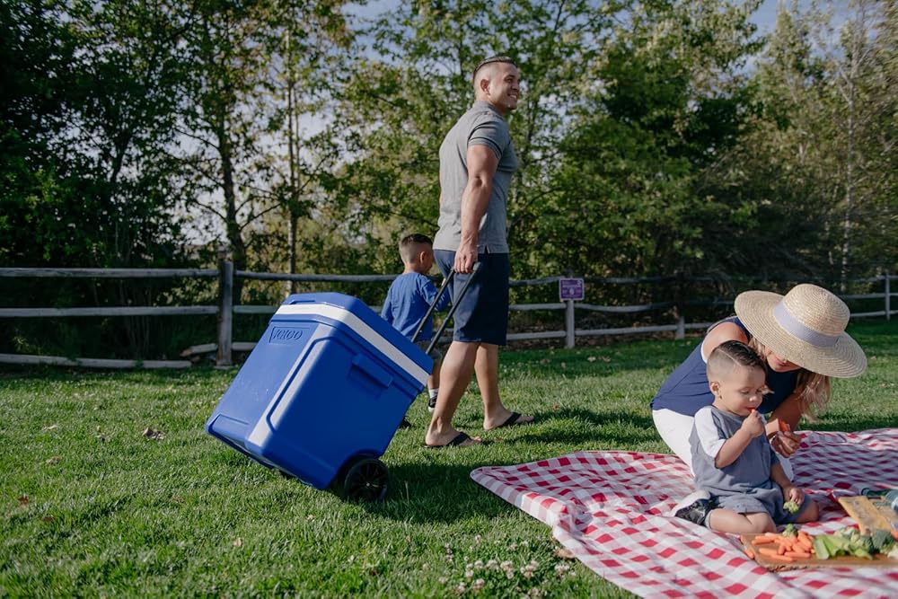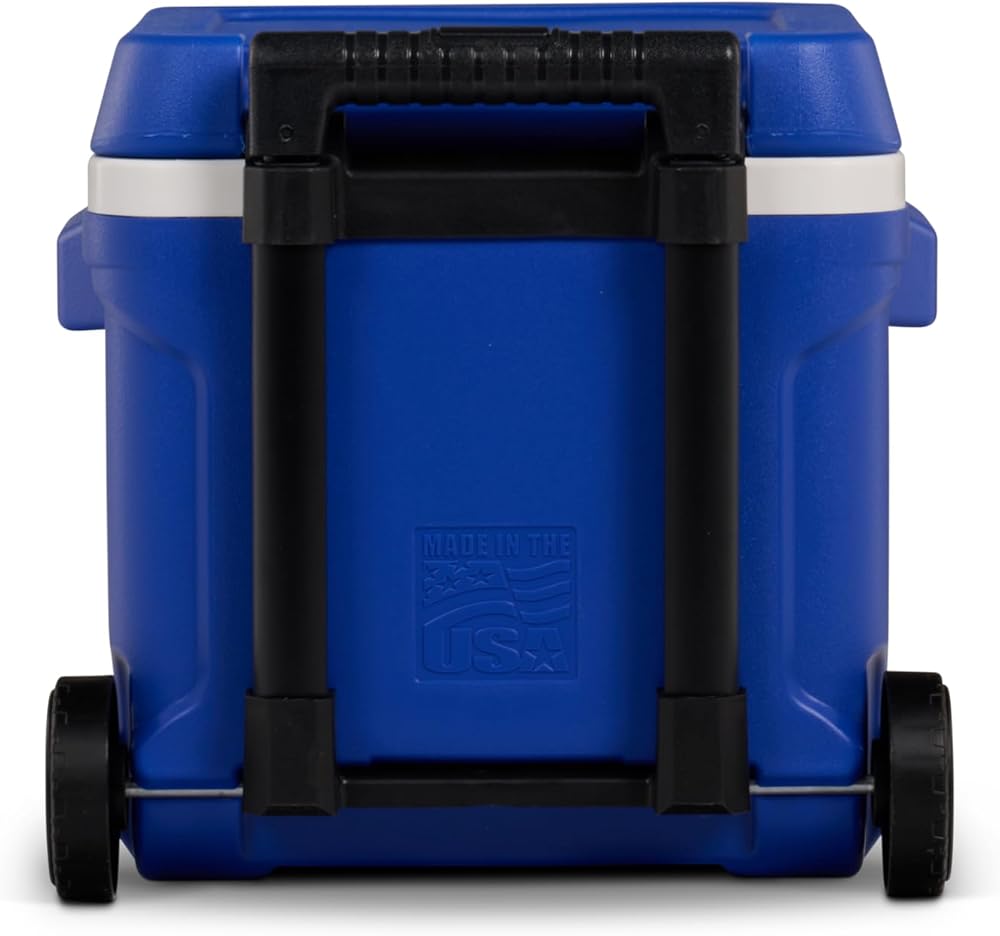 Keep your drinks cool while hauling them around in the Igloo Profile Roller 60 qt Cooler. With the spacious interior and the wheels with the locking, telescoping handle make it easy for you to pack, roll and store your favorite drinks and food anywhere you need to be. The Cool Riser Technology means that the design has been thoughtfully crafted to improve cooling, so don't eat lukewarm food again!