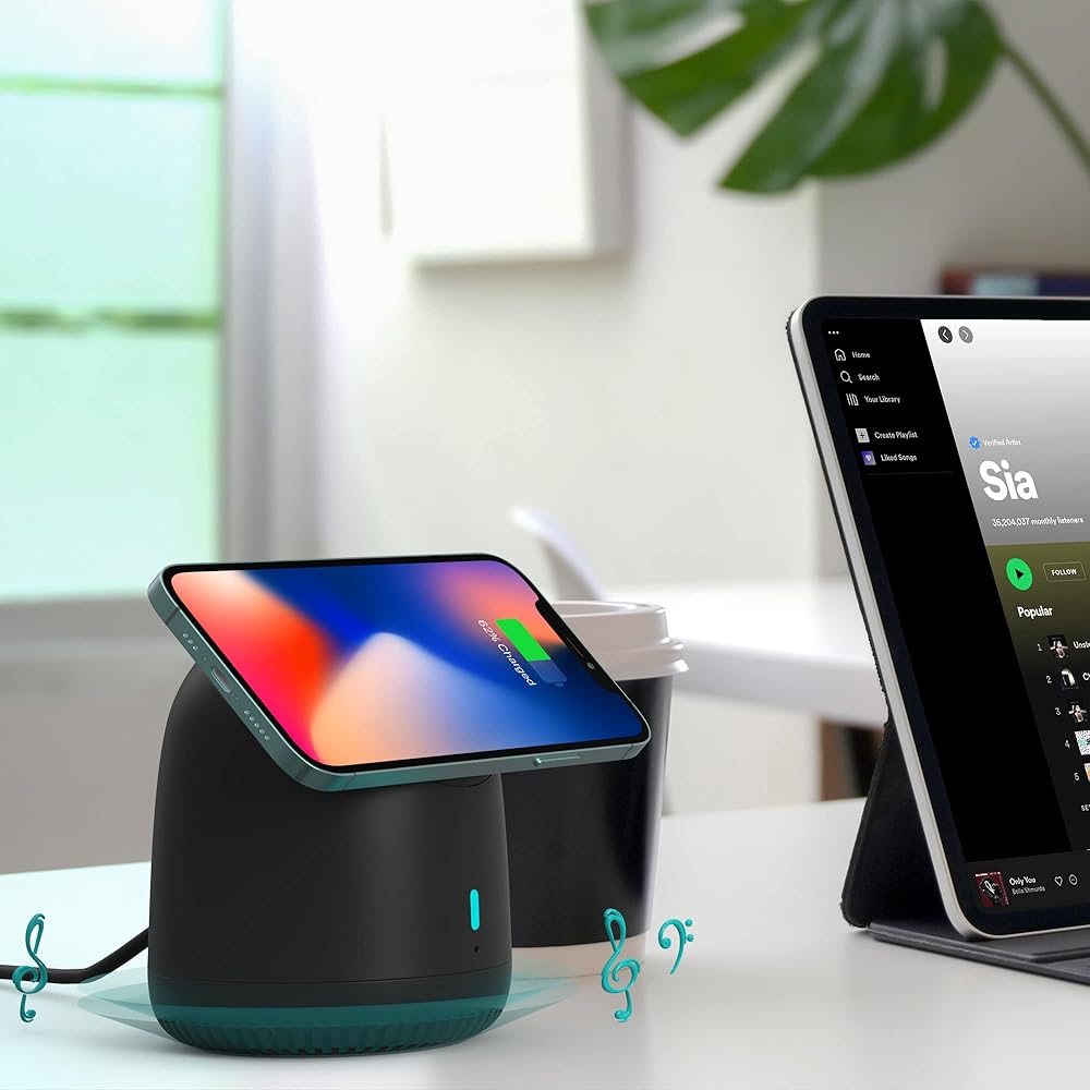 7.5W WIRELESS CHARGING: Compatible with iPhone 12,13 14 & 15 series; requires to be plugged into 18W+ adapter(Not included) to wirelessly charge Capo speaker and phone