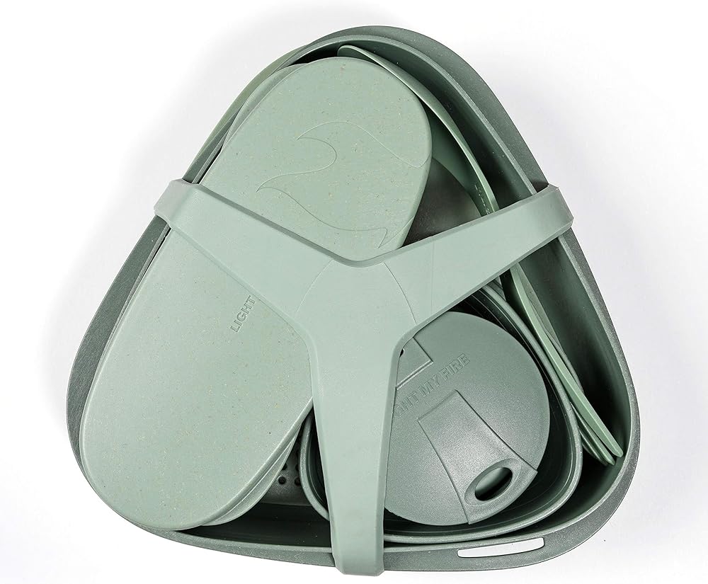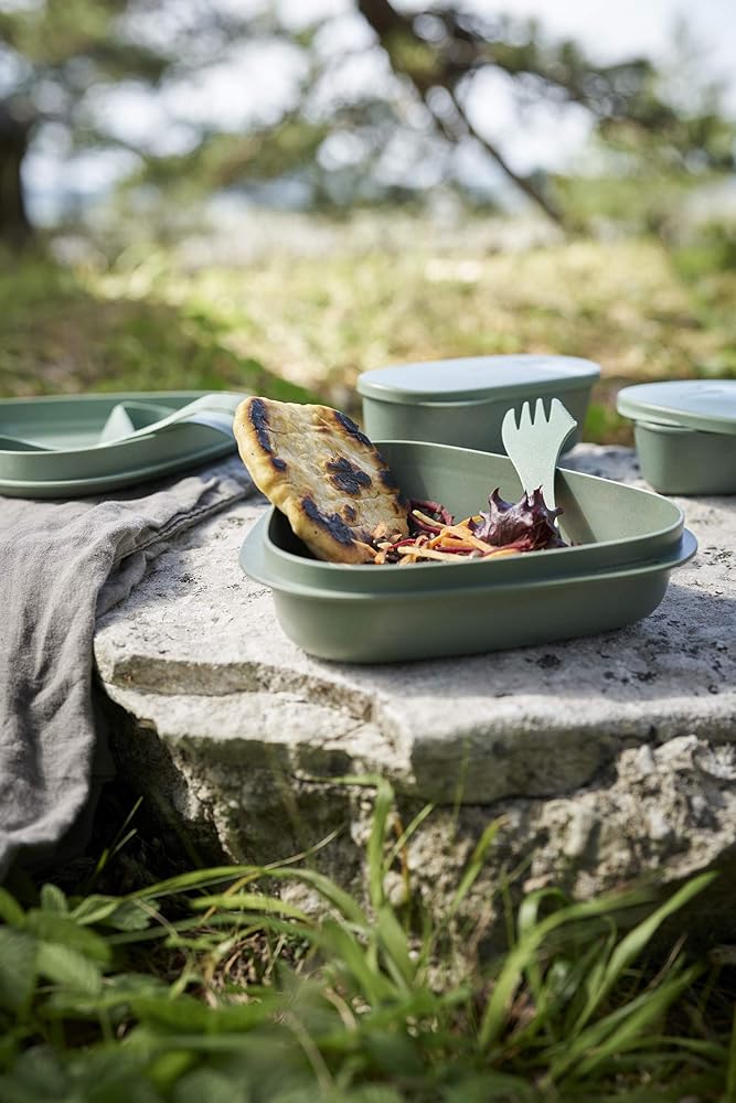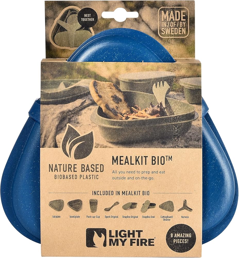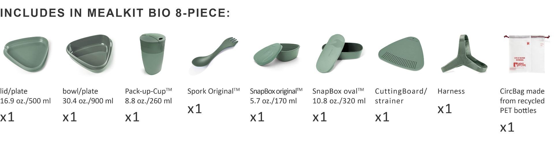 PACKAGE CONTENT - Picnic cutlery set "MEALKIT 8 Pcs" - Including: 1 x plate / lid 16.9 Oz, 1 x bowl 30.4 Oz, 2 x airtight storage containers with lid (5.7 Oz / 10.8 Oz), 1 x Spork Light My Fire, 1 x harness, 1x cutting board, 1x foldable cup. Microwave and dishwasher safe. 100% reusable camping eating set made of bio-based plastic and is 100% BPA free. The only mess kit you'll ever need. The camping gear set is microwave and dishwasher safe.