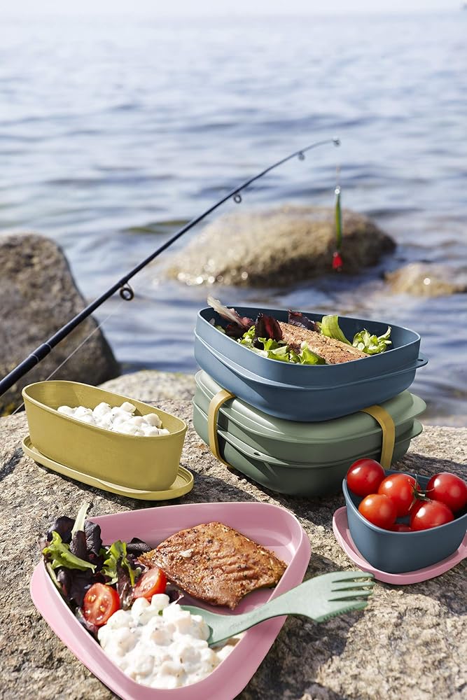 A CONVENIENT TRAVEL CUTLERY SET - The lightweight and space-saving all-in-one compact picnic set for outdoor adventures and urban activities. Stackable camping dining set with elastic harness to keep the camping bowls and plates together and closed. Ideal as a lunchbox in the office and on the go - or when going camping and hiking. With the small containers you can bring a salad separated from the main meal or a handful of nuts and seeds. This set includes a Lunchbox cutlery and foldable cup.