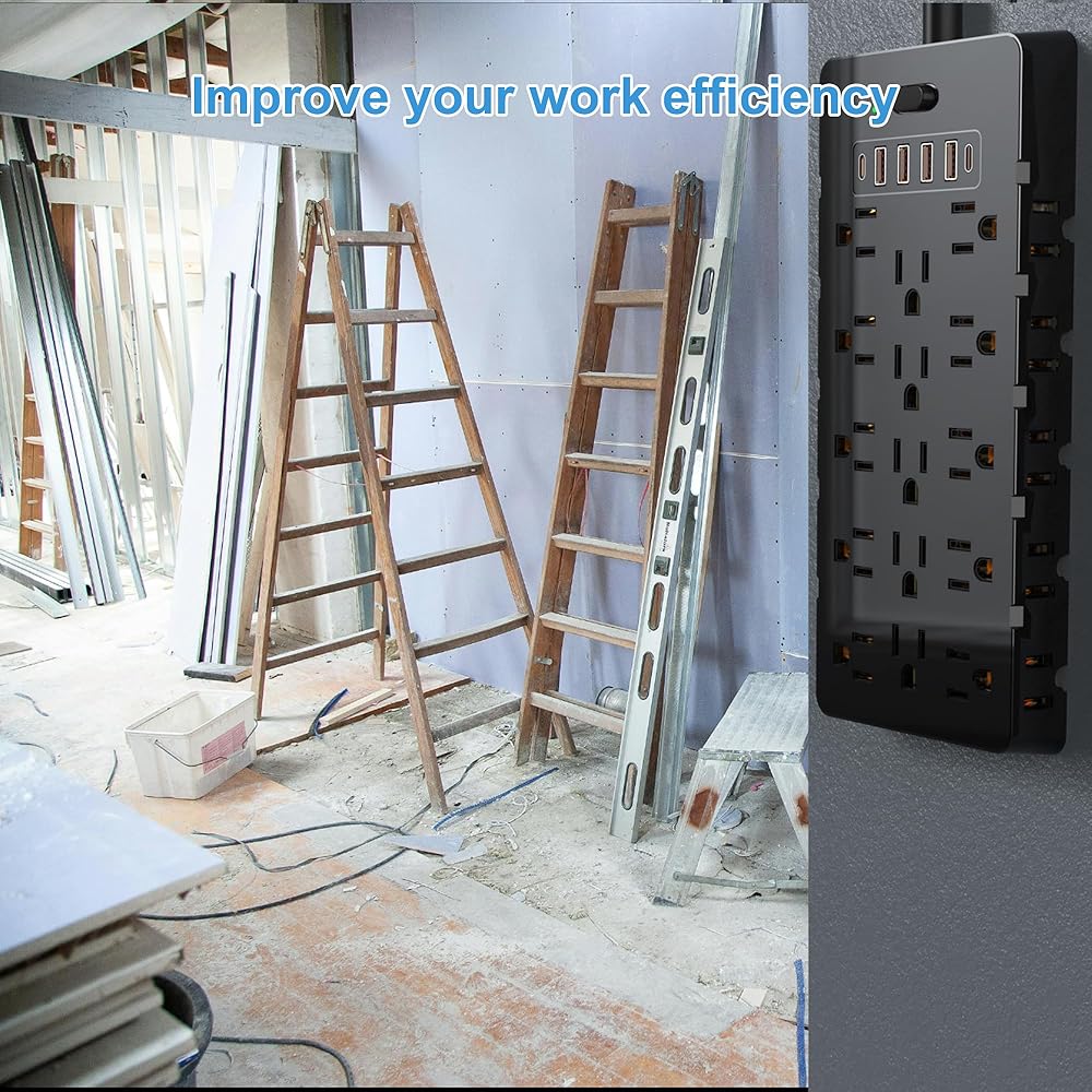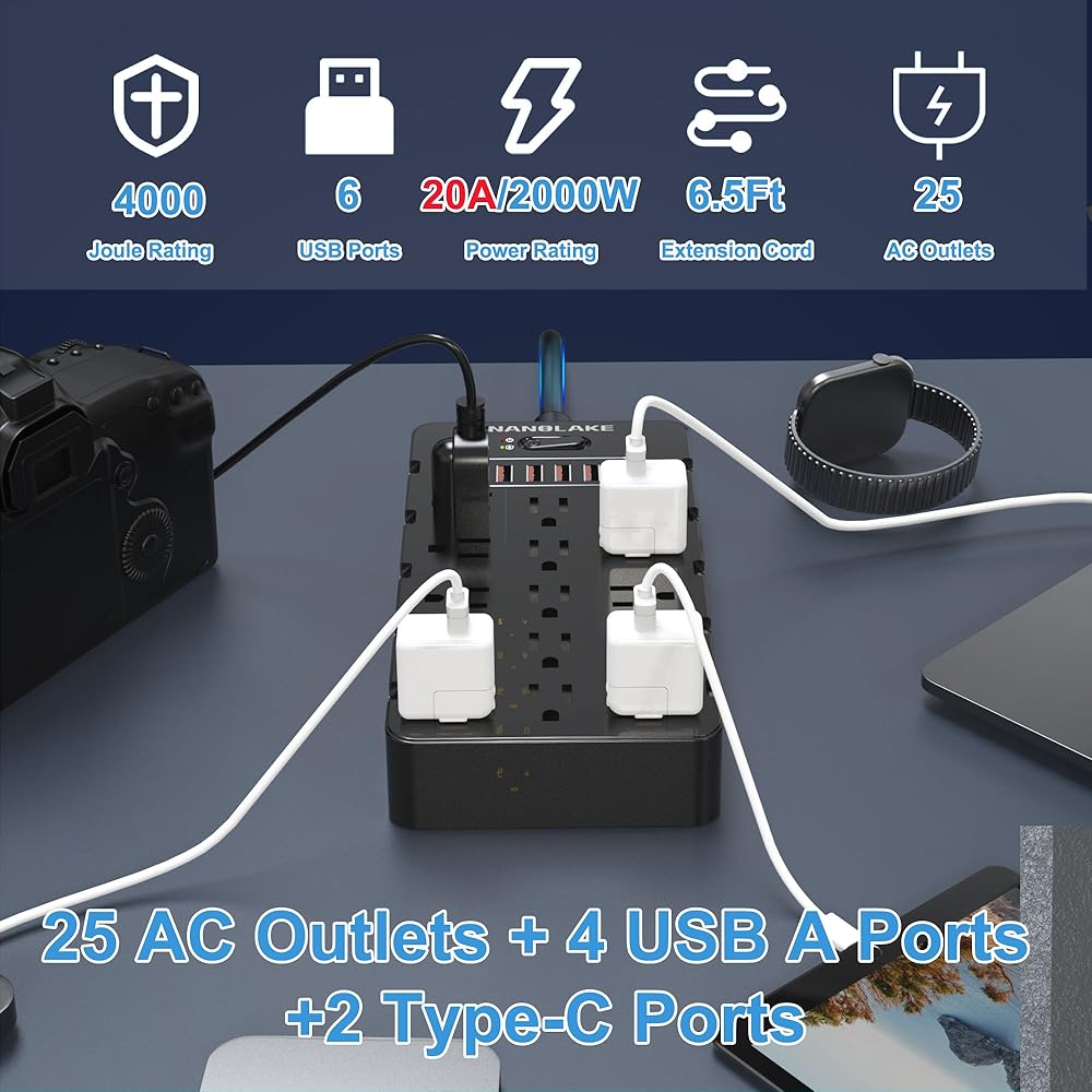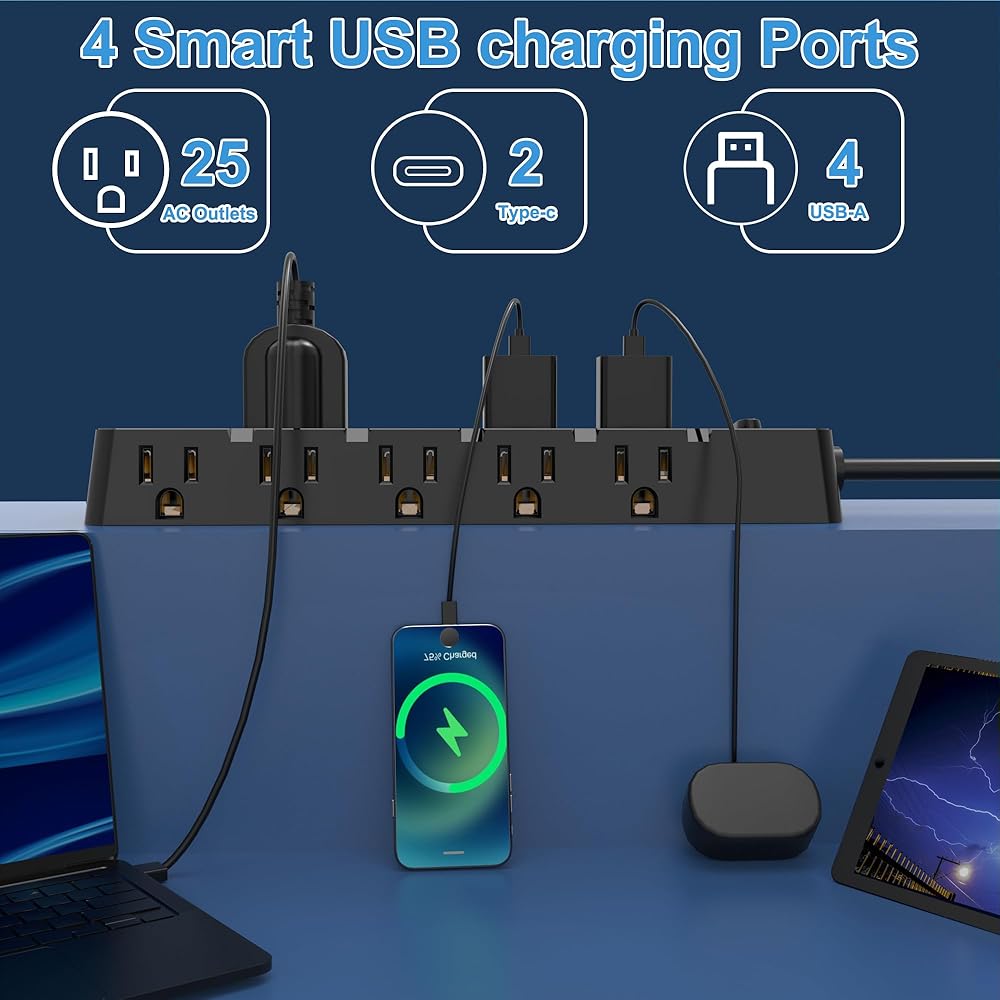 Diverse Charging Outlets: Our power strip offers 6 USB ports including 4 USB-A & 2 Type-C ports, with built-in smart charging technology for faster and intelligent device charging.