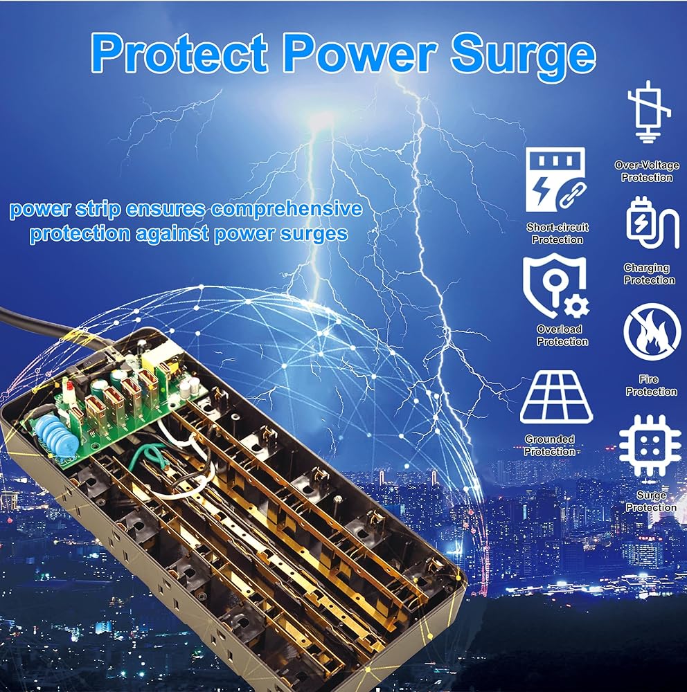 4000 Joules surge protection: Incorporates 4000 Joules of surge protection, offering extensive protection against voltage spikes for connected devices. Combines a heavy duty surge protector with eight safety features to ensure the protection of you and your devices. includes fire resistance, overload / grounded / over current / over voltage / short-circuit / over-heating protection, and offers a high energy absorbing capacity of 4000 Joules. The system is composed of a 3-level complementary Integrated Circuit consisting of TVS (transient voltage suppressor), MOV (metal oxide varistor), and GDT (gas discharge tube)