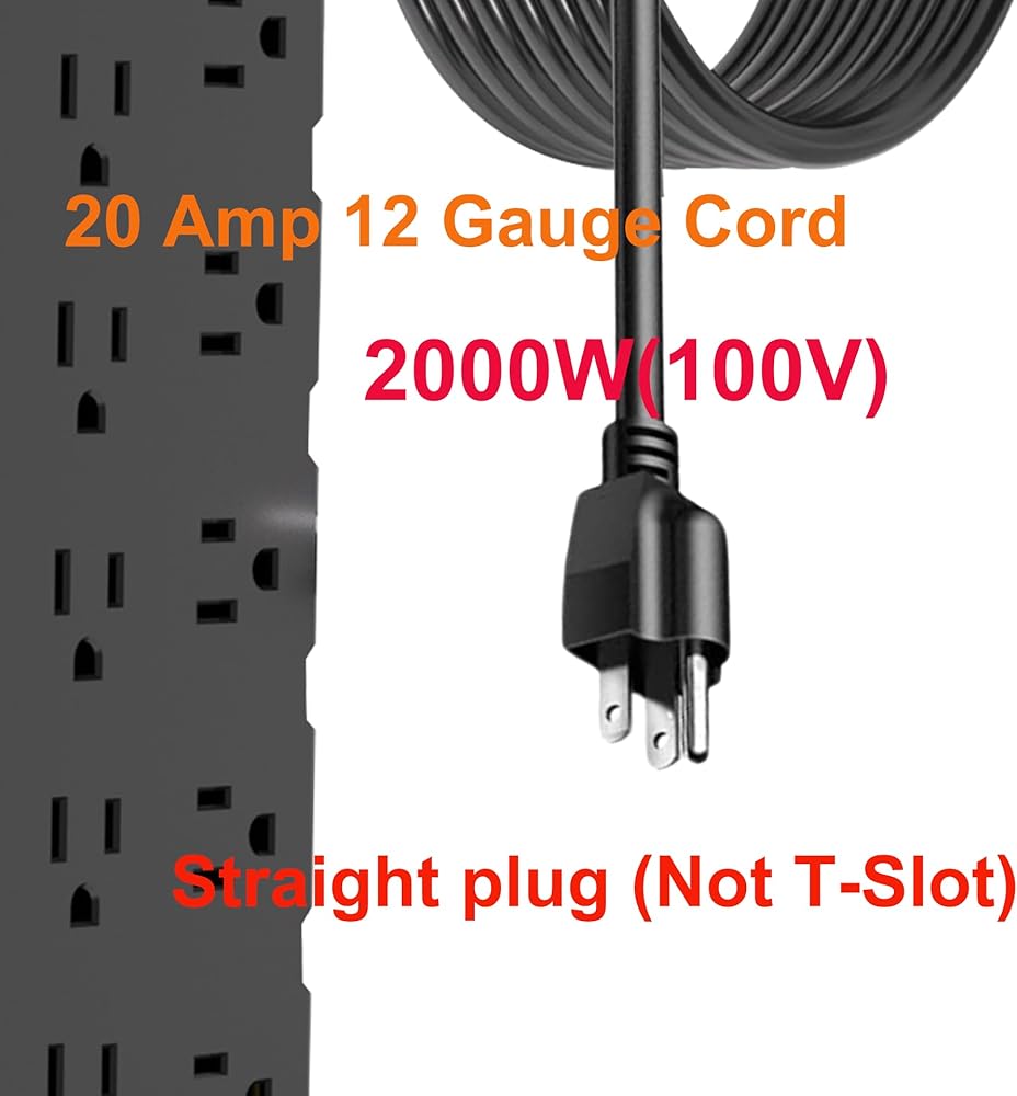 20 AMP 2000W power strip with flat plug: The Massive Powerhouse Large 20 amp power strip with normal flat plug (Not T-plug) is designed for many devices simultaneously pluging in one power strip.The rated power capacity is 2000W (20A-100V rated) or 2500W (Max.). The power strip is quipped with 25 grounded AC outlets and 6 USB ports. 1.8 in spaced outlets, and flat plug (instead of T-plug) is versatile for most common places, when you need a power strip for plenty ampliances , This power strip is an ideal type.