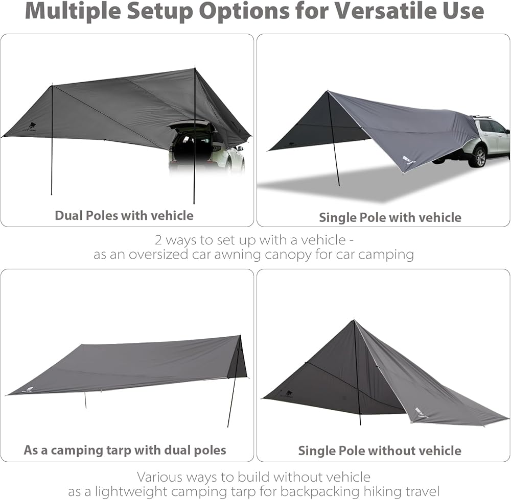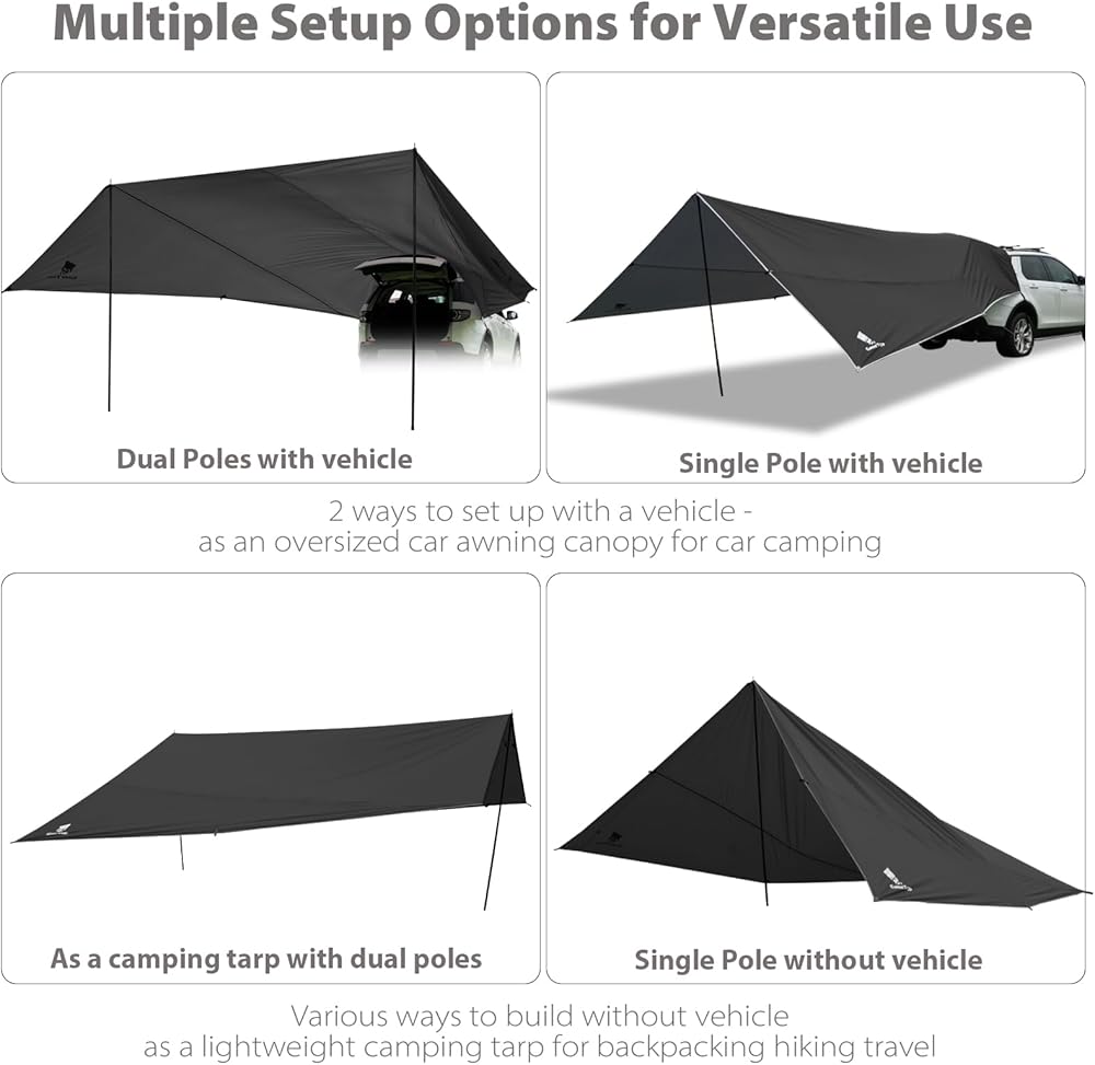 【Versatile Setup Options】Option 1: Single pole "A-frame" setup with the vehicle for added privacy; Option 2: Dual pole "awning" setup with the vehicle for maximum shade and shelter; Option 3: Dual pole "A-frame" setup without a vehicle, serving as a camping tarp shelter
