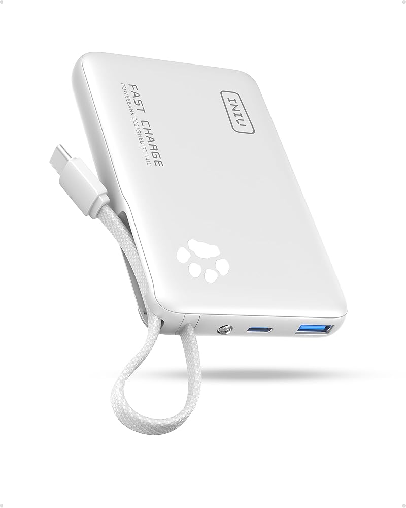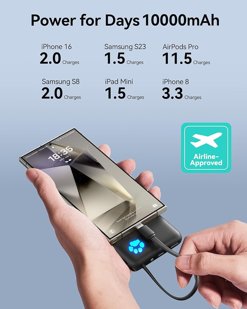 Grab & Go, No Extra Wires Needed: This 10000mAh power bank features a built-in USB-C cable that charges both your phone and the power bank and doubles as a lanyard. Leave home without extra cables.