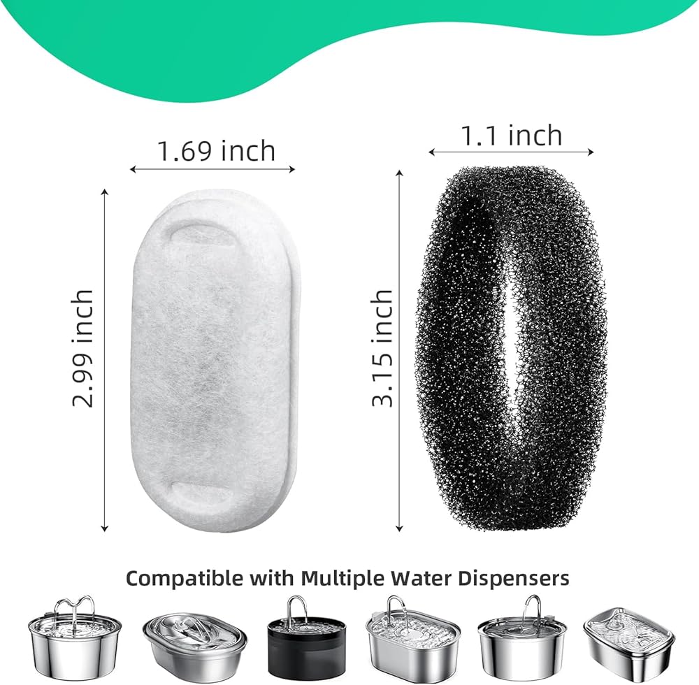 Universal Compatibility with Multiple Models: This cat water fountain filter is perfectly designed to fit various stainless steel pet fountains, including models with capacities of 67 oz/2L, 101 oz/3L, 108 oz/3.2L, and 135 oz/4.0L. With filter dimensions of 2.99 x 1.69 inches and sponge dimensions of 3.15 x 1.1 inches, these replacements are a perfect match for your existing setup. Please check your fountain model to ensure compatibility