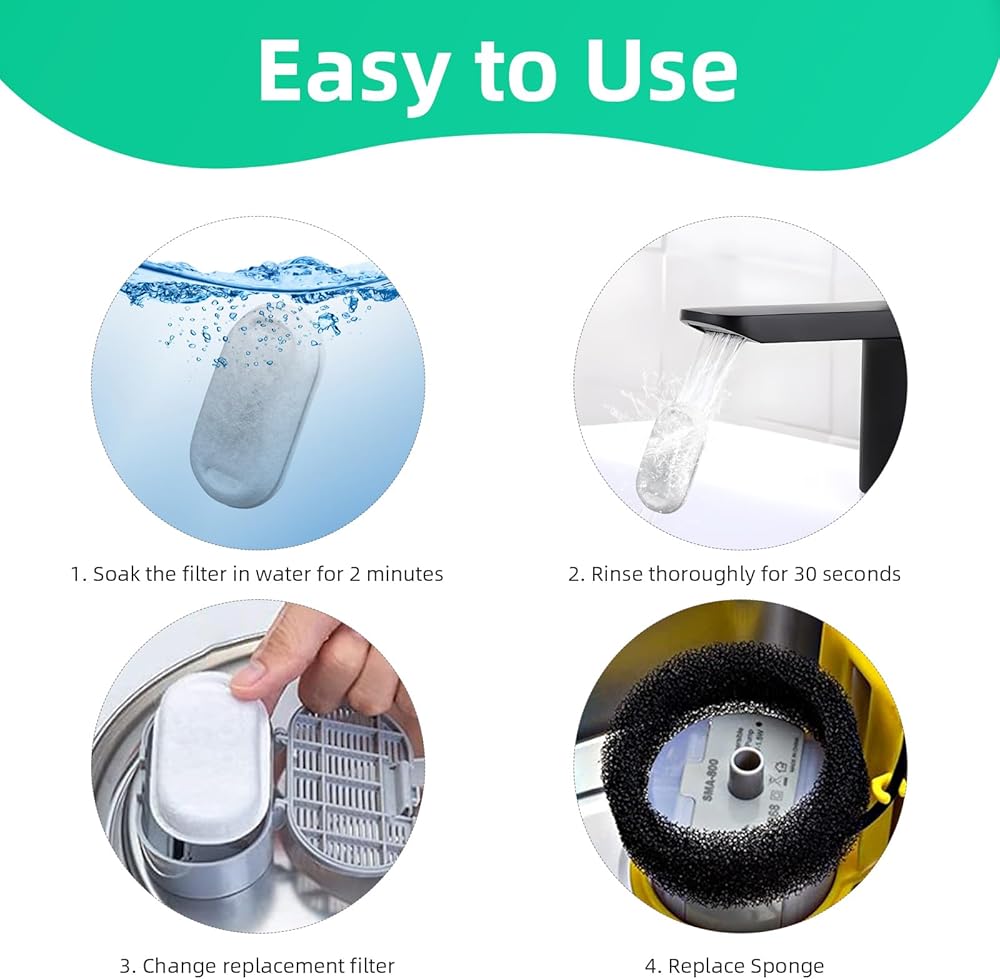 Easy Installation and Efficient Maintenance: Installing and maintaining our pet water fountain filters is a breeze. Simply soak the filter and sponge in water for at least 3 minutes before use to activate optimal filtration. After soaking, rinse thoroughly under running water. This quick preparation helps keep your cat's drinking water fresher for longer, saving you time and effort in cleaning