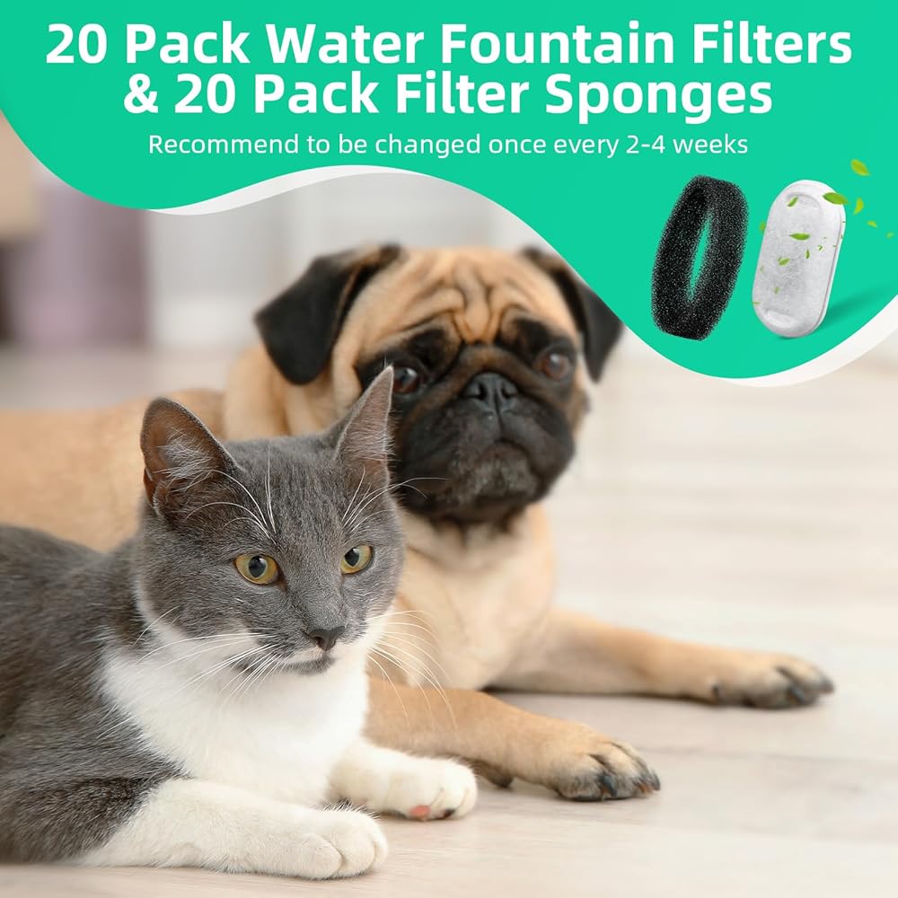 Comprehensive 40-Piece Set for Long-Lasting Use: Our cat water fountain filter replacement package includes a total of 40 pieces—20 high-quality cat fountain filters and 20 pre-filter sponges. Each filter and sponge is individually packaged and sealed, ensuring you always have a fresh and ready-to-use filter on hand. This extensive set offers a convenient and cost-effective solution for maintaining your pet's water fountain