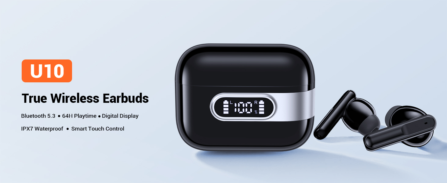2.Dual LED Power Display. The Bluetooth earbuds has a dual digital battery display case. The Left and right LED light bar display the charging status of the Bluetooth earphones, and the digital number shows the battery level of the charging case.This feature allows you to keep track of the charging case and charge it in a timely manner.