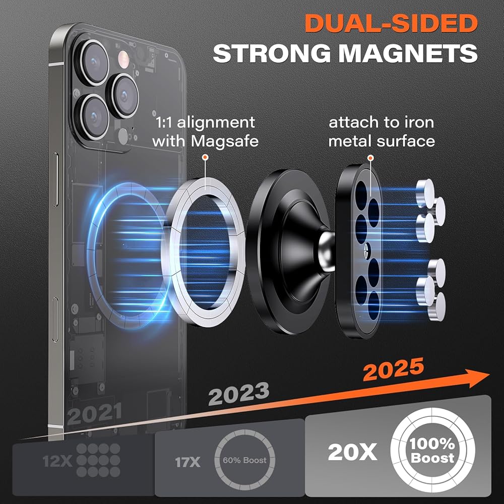Exactly Designed for Magsafe: 17 solid N54 magnets are used to precisely match the Magsafe of iPhone 16, 15, 14, 13, 12 series. Note: For other iPhone models or non-MagSafe compatible phones, the included metal magnetic ring must be used for optimal magnetism