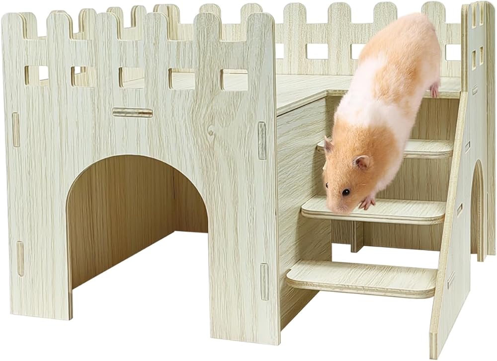 Hamster Cage Accessories: This hamster hides has a simple and elegant wood appearance which can greatly increase the ornamental value of the hamster cage. The habitat has several secret spaces, lookout holes and a small ladder, provide a playground for mouse to hide, store food, climb and play. Satisfies their playing instinct and helps reduce their loneliness and boredom.