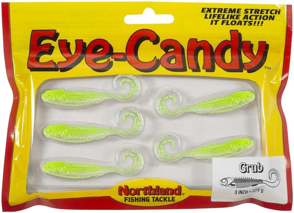 SUPERIOR ACTION: The double curl tail of the Eye-Candy Grub ensures ceaseless movement in the water. It kicks, swims, and never stops moving to entice strikes from walleyes and other gamefish.