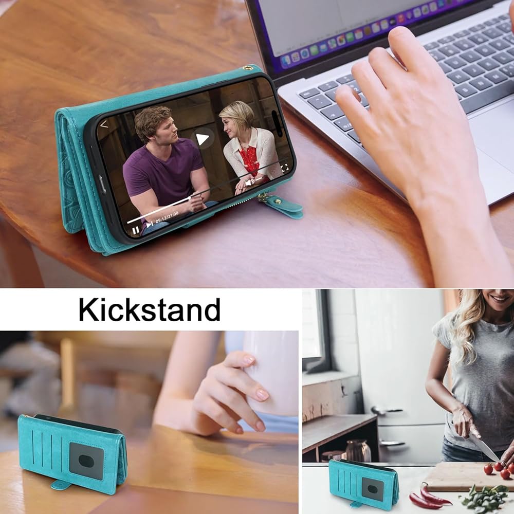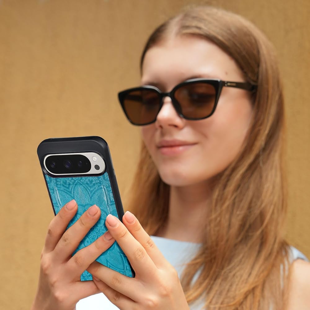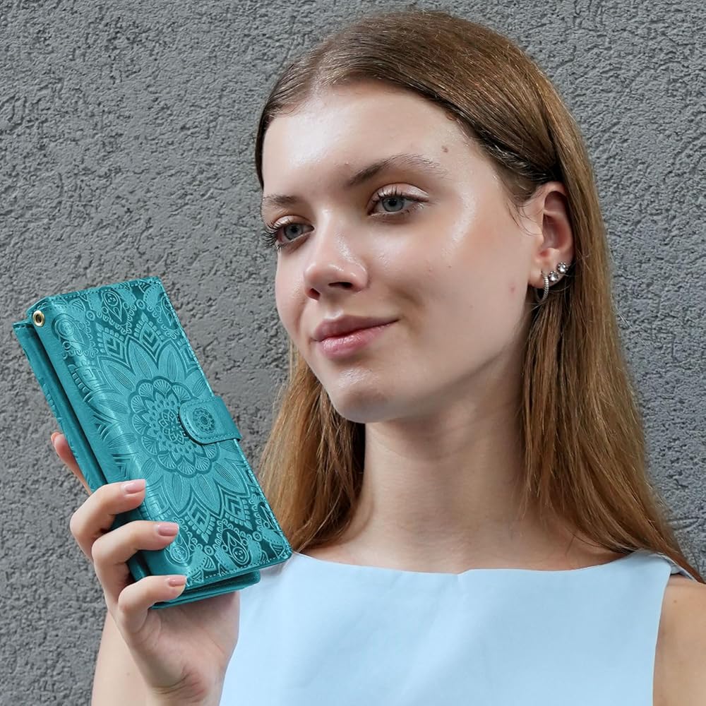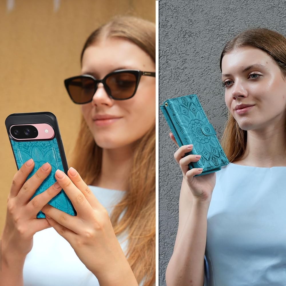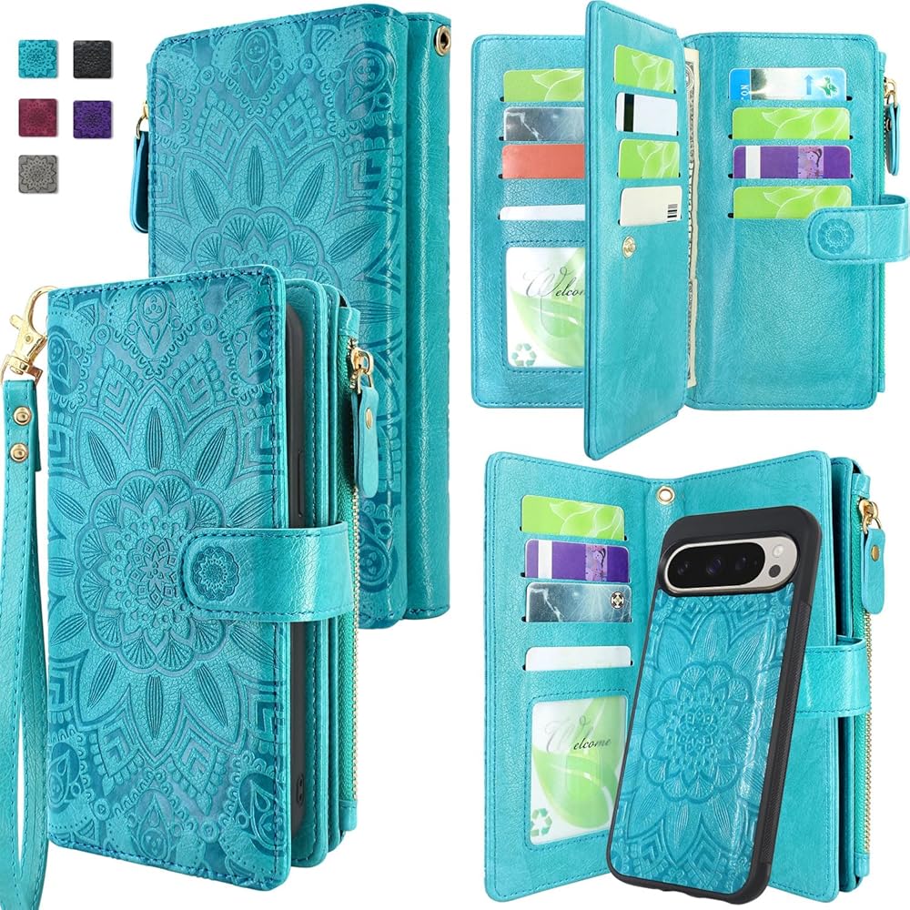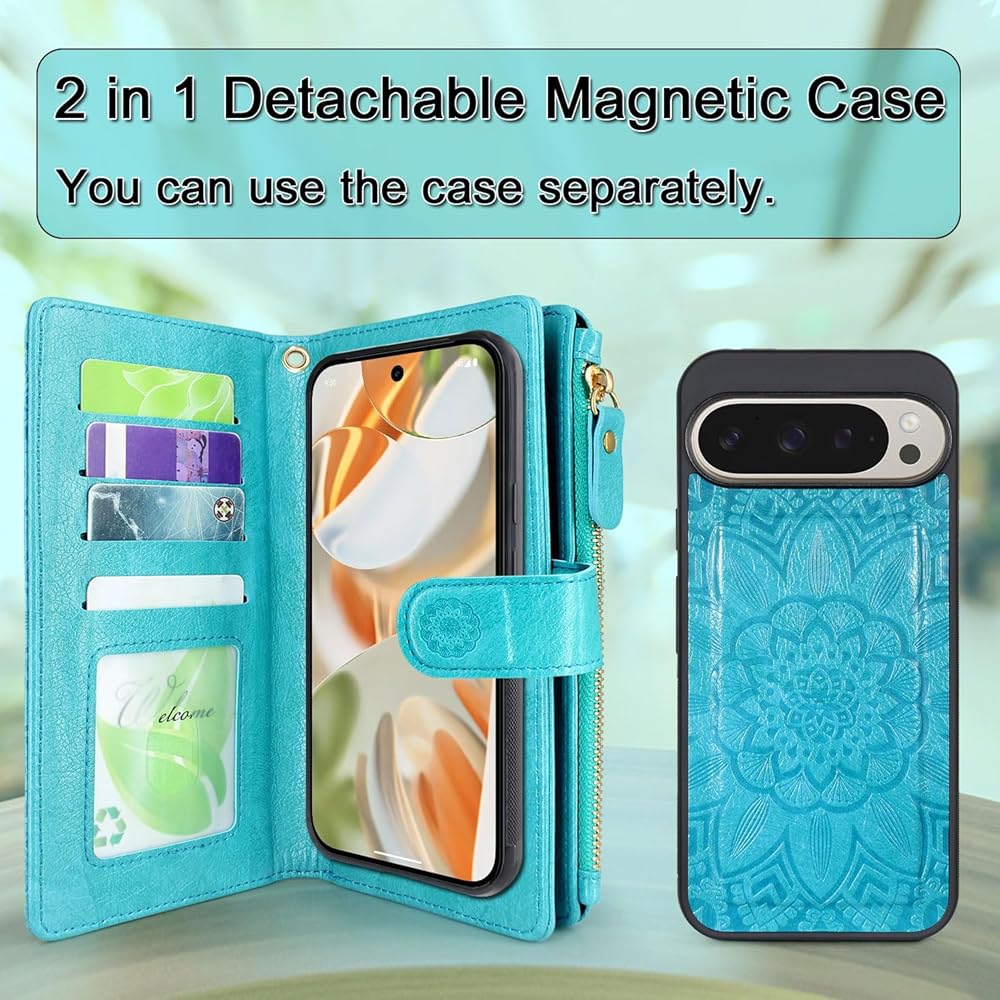 Harryshell Detachable Wallet Leather Case Compatible with Google Pixel 9/9 Pro / 10/10 Pro Magnetic Phone Case Zipper with Cash Coin Pocket Multi Card Slot Wrist Strap Lanyard (Flower Blue Green)