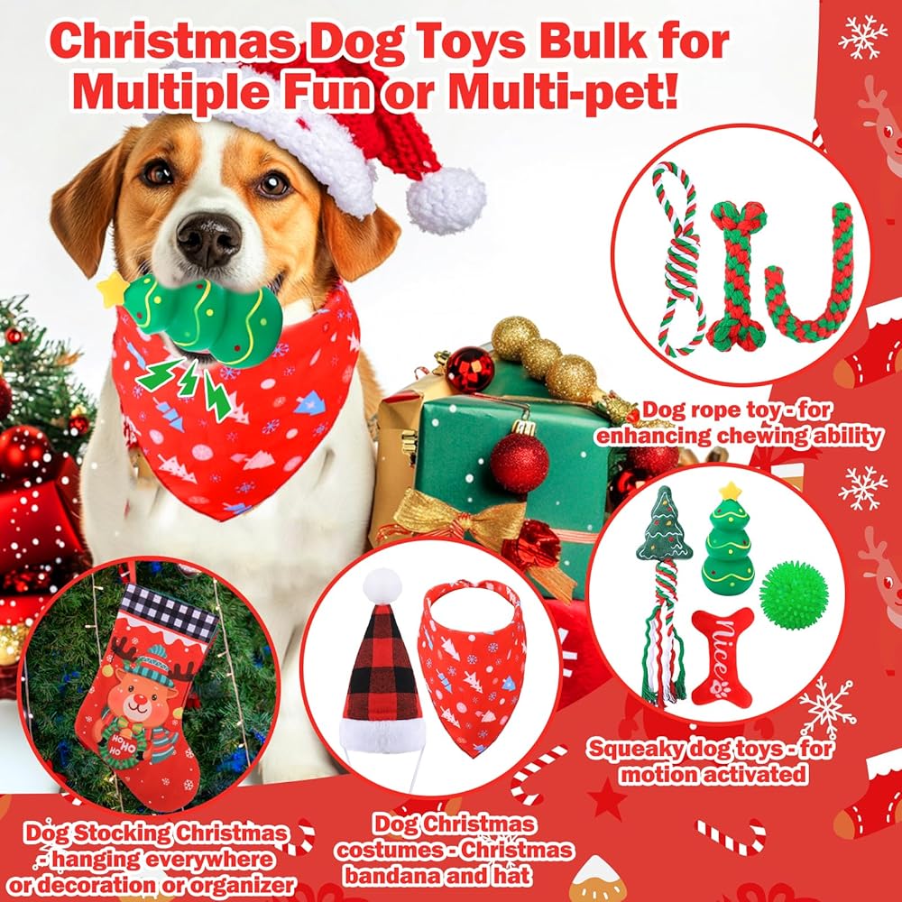 Dog Toys Christmas Pack: Comes with 3pcs dog rope toy, 4pcs squeaky dog toys, a set of dog costume(hat and neck decoration) and dog stockings christmas for organizing all toys or hanging on the christmas tree for decorations, your dogs and family will spend a warm and happy christmas