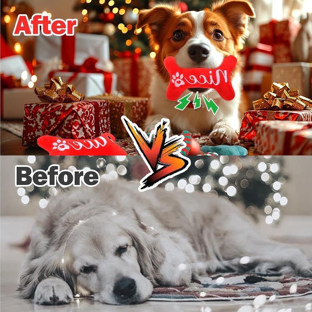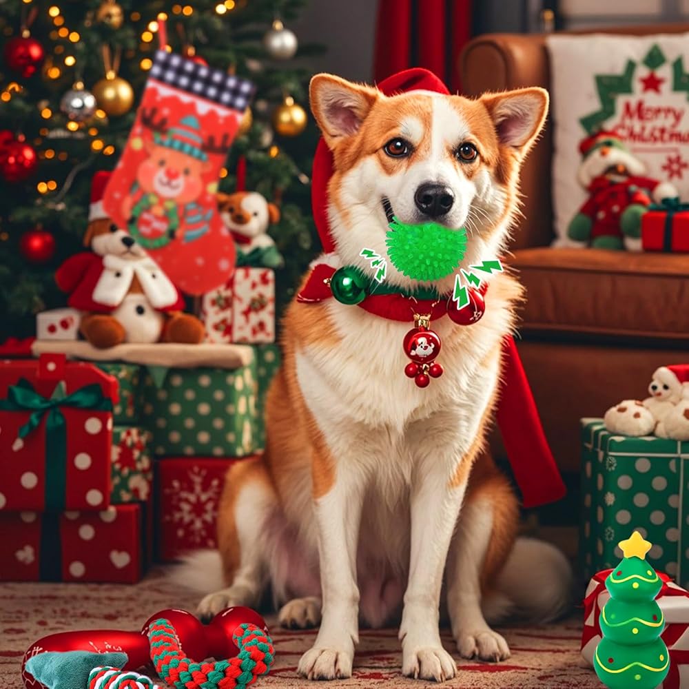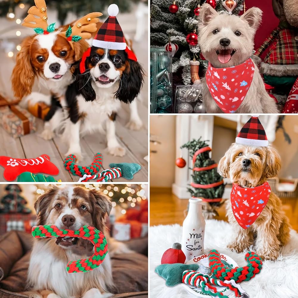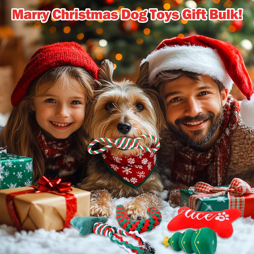 Dog Christmas Gifts: Just like everyone receive a gift on christmas, your dog will feel valued getting christmas dog toys on this special day, the christmas pattern and shape of dog toys will bring strong festive atmosphere to your house also, remember to wear the hat and neck wear for your dogs and leave the happy moment on the camera