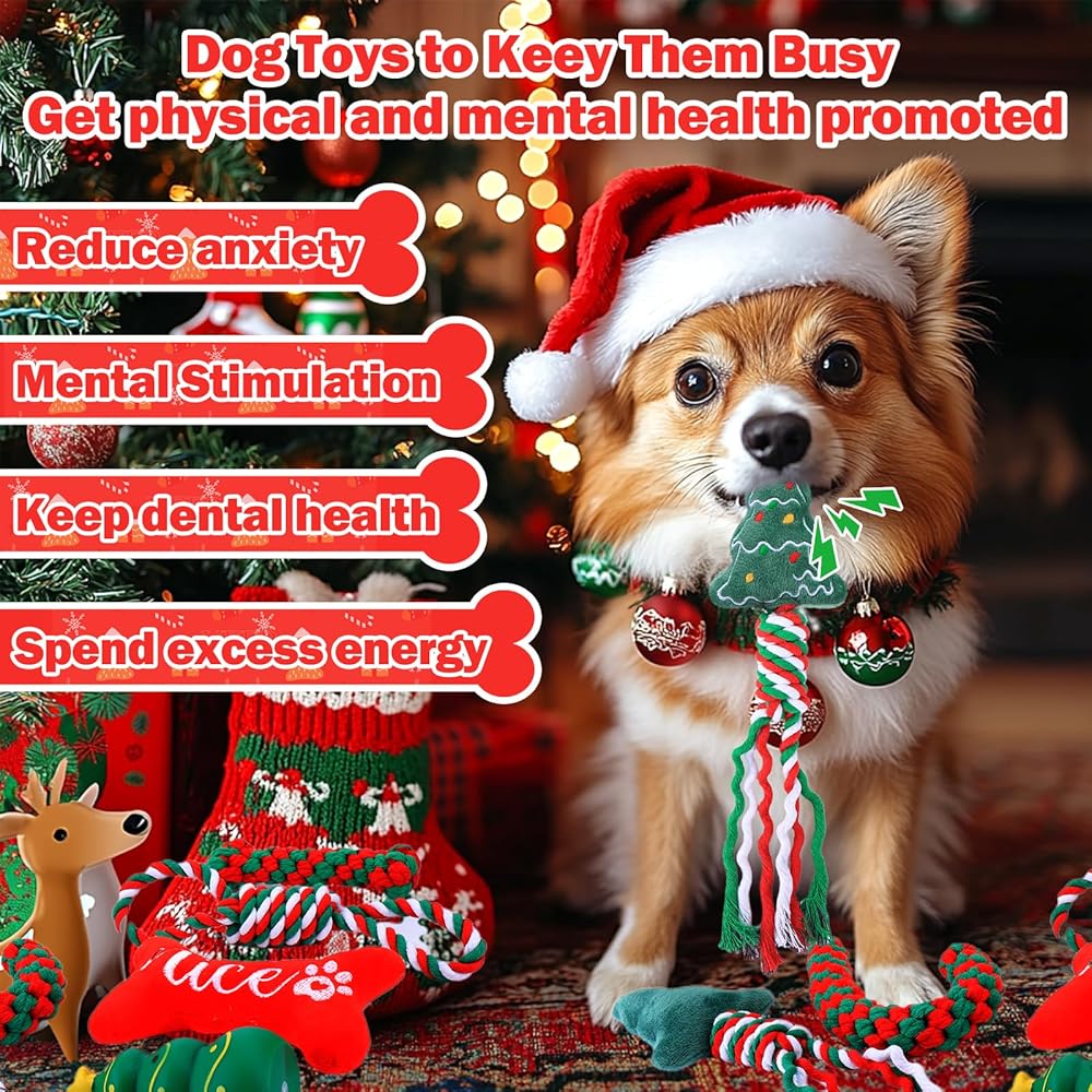 Mity rain Christmas Dog Toys, Dog Stockings Christmas with Toys, Dog Toys Christmas Pack for Large/Medium/Small Dogs, Dog Christmas Gifts of Squeaky Toys Rope Toy Dog Costume for Teething Bulk