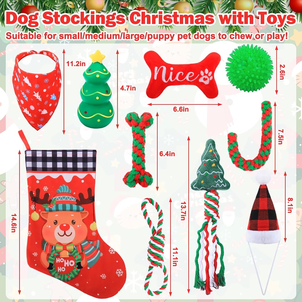 10PCS Dog Stockings Christmas with Toys: This dog stockings christmas contain 9 different toys inside the stock, if you are finding christmas gifts for your dogs, this dog stockings christmas bulk will be a good choice