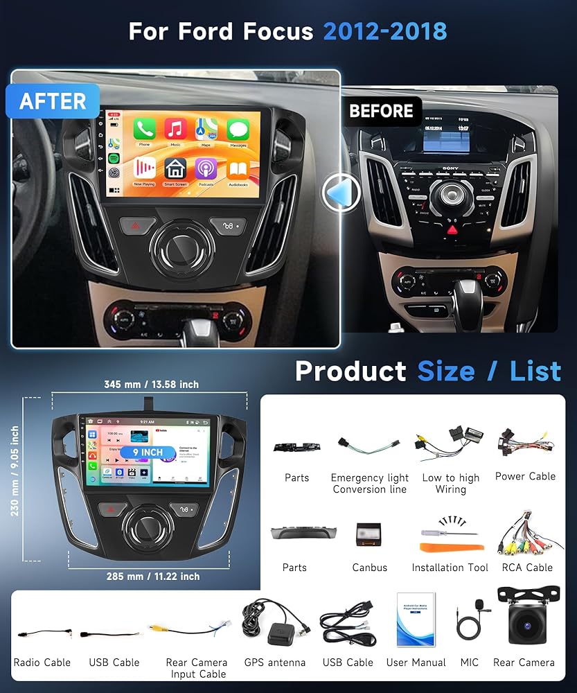 Android Car Stereo for Ford Focus 2012-2018: Upgrade your driving experience with our Android Car Stereo designed specifically for Ford Focus 2012 2013 2014 2015 2016 2017 2018 models. Please ensure compatibility by checking the year, dimensions, and shape of your vehicle's center console before making a purchase. For any uncertainties, feel free to send us messages or pictures for personalized advice.