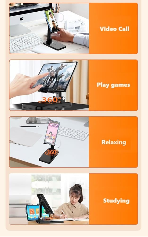 Enhanced Flexibility: With a 360° rotation base and adjustable height feature, our cell phone stand offers unparalleled flexibility. The swiveling axis connecting the base allows you to effortlessly adjust your phone to any angle, facilitating easy screen sharing with friends while ensuring stability throughout.