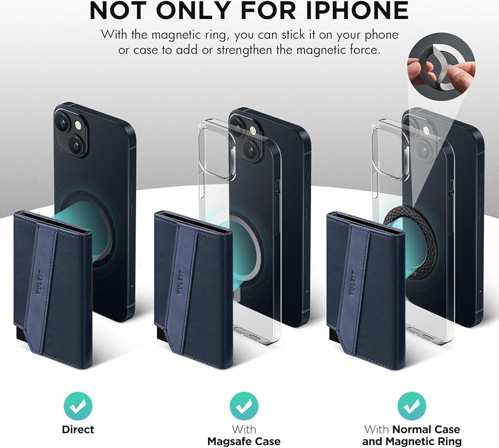 Magnetic Lock: The magnetic design at the backside of the wallet securely attaches it to your iPhone 12-15 series or any case, which is compatible with iPhone`s Magsafe function.