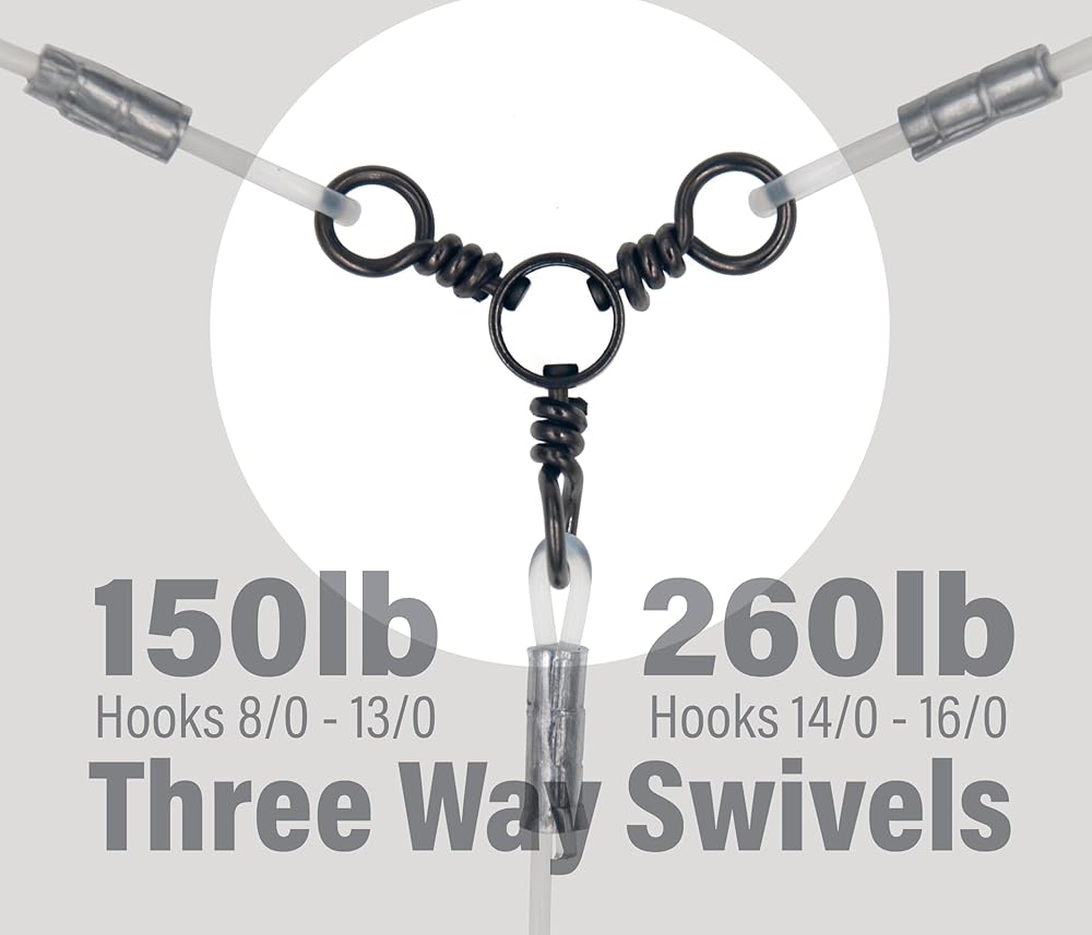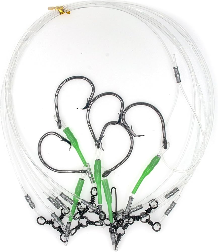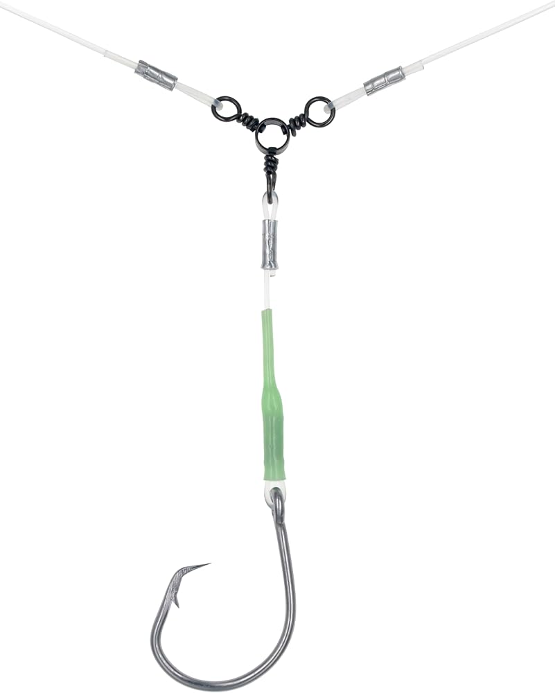 This durable deep drop rig from Xubbwov features 5 stainless steel Tuna circle hooks ranging in size from 8/0 to 16/0 for catching a variety of large saltwater species. Each hook is fitted with a glow sleeves to attract fish in low-light conditions underwater. The rig is designed for offshore fishing down to depths of 300 feet using heavy duty 380lb mainlines and branchlines. Made for targeting snapper and tilefish in deep water, this rig is perfect for serious anglers looking to battle big game fish. The circle hooks are made of stainless steel and the three-way swivels has a black nickel finish for durability in marine environments.