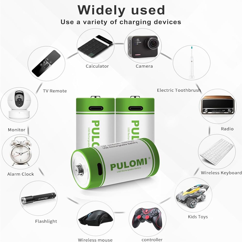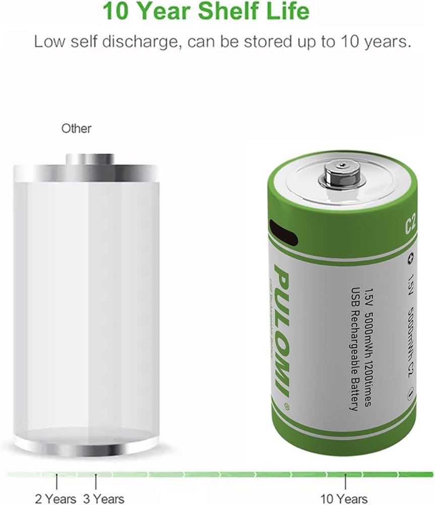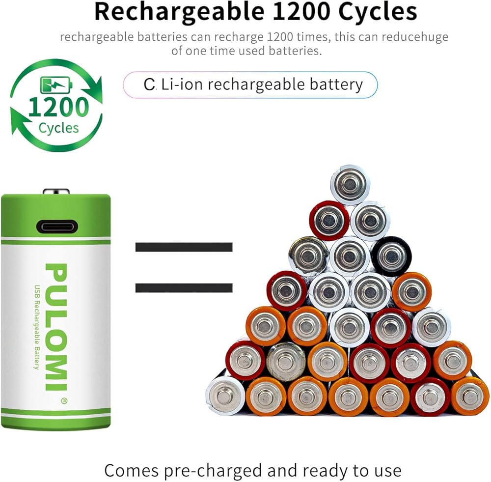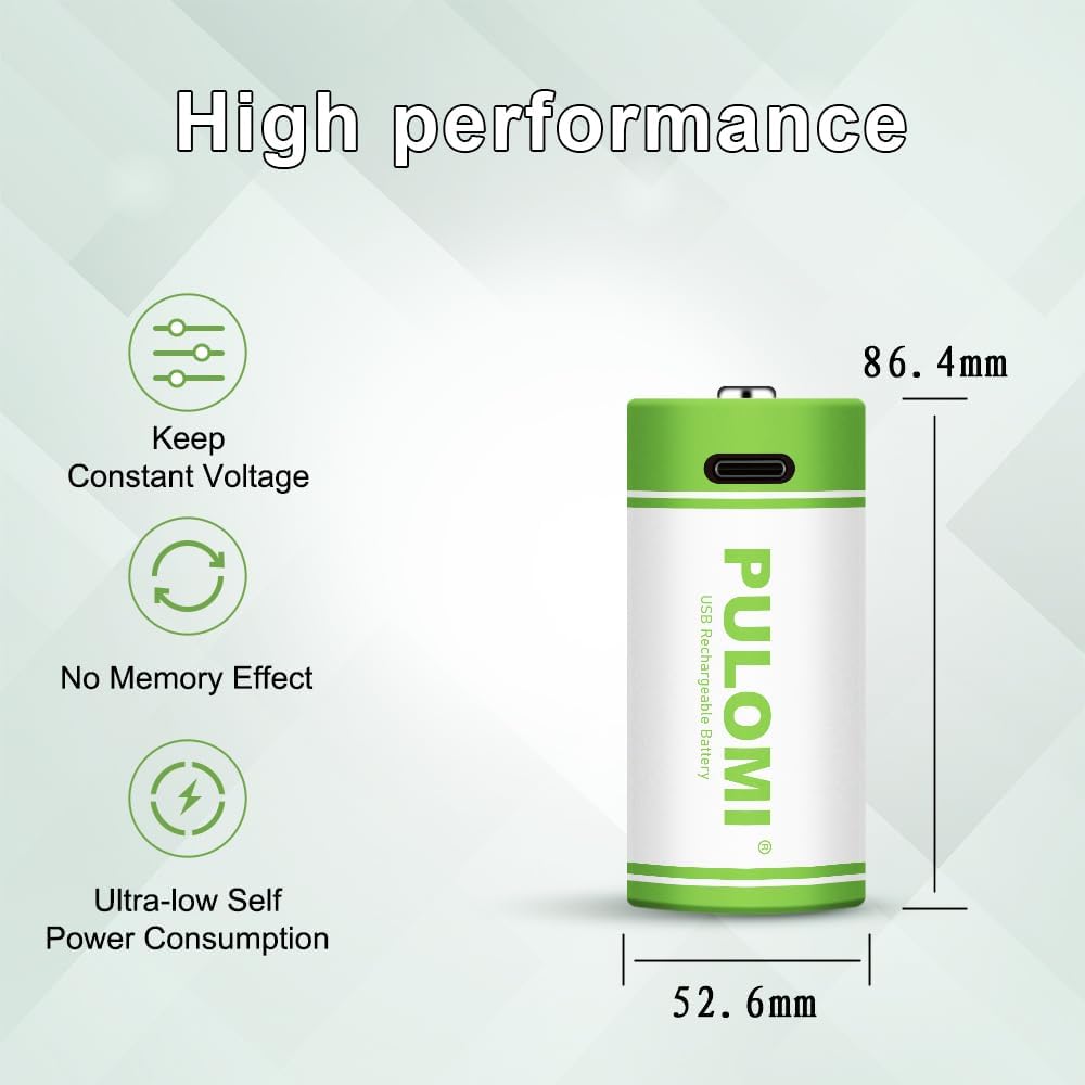 PULOMI USB Lithium ion Rechargeable C Battery, High Capacity 1.5V 5000mWh Rechargeable C Battery, 2.5 H Fast Charge, 1200 Cycle with Type C Port Cable, Constant Output,2-Pack