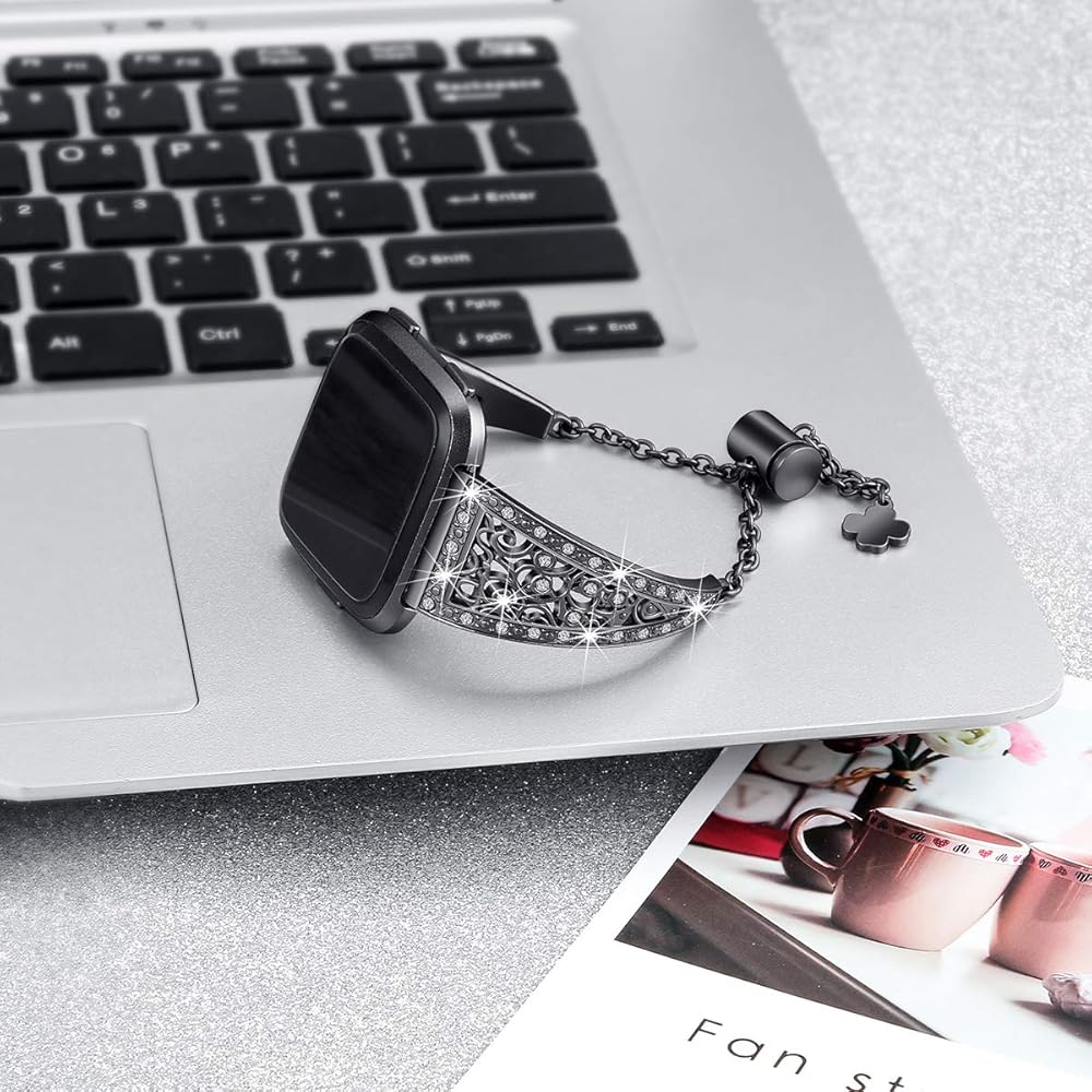 AISPORTS premium fashion stylish elegant lightweight slim crystal bling glitter diamond jewelry adjustable replacement band with stainless steel metal push-button style lock buckle clasp bracelet wristband for Fitbit Versa 2 / Fitbit Versa / Fitbit Versa Lite Smart Watch.