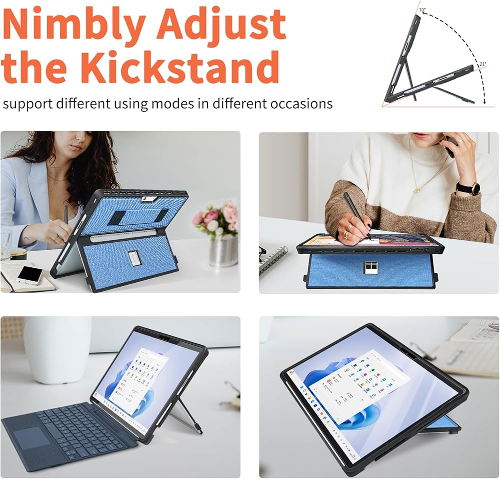 【Comfortable Experience】Featuring a channel for seamless connection to the Microsoft Surface Pro 11, Pro 10, Pro 9, Pro 8 type cover keyboard, this case allows users to easily use their device without having to remove the case. Adjusting to different angles is made easy with the built-in kickstand, allowing you to find the perfect viewing position without having to remove the case. The durable hard shell also safeguards the built-in kickstand from scratches, bumps, and stains.