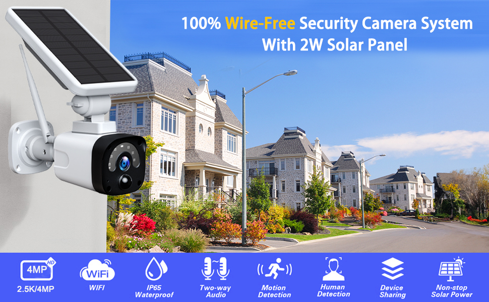 【4MP/2.5K FHD Night Vision& 120° Wide Angle 】Built-in 2 infrared LEDs and 4mm lens, the solar camera security outdoor can present a crystal image and video in crisp 4MP resolution. Meanwhile, it allows you to see clear images in semi-dark or full darkness with the help of IR illumination or ambient light within a 120°wide view of 32 Feet. The solar security camera system can work in between -4°F to 122°F (-20°C to 50°C) temperatures.