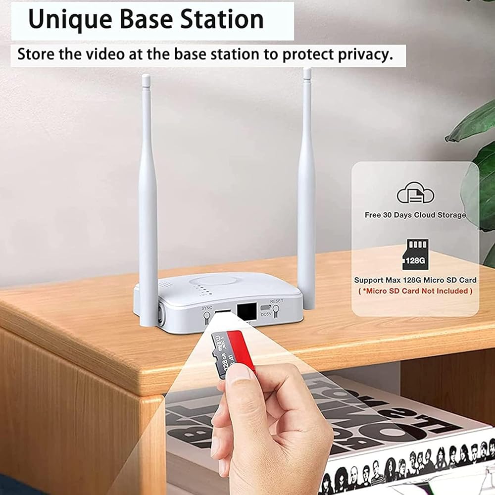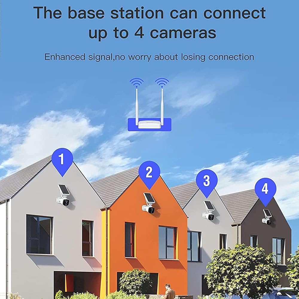 【Solar Powered &100% Wirefree】No additional power supply is required, the 4 solar security cameras are equipped with solar panels and rechargeable batteries to provide non-stop power, so you do not need to take off the cameras for recharge frequently.100% No Hassles of Wiring, can be installed anywhere. (Notes: The base station does not support connecting to the network via 2.4G/5G WiFi, but can only connect to the router via a network cable)