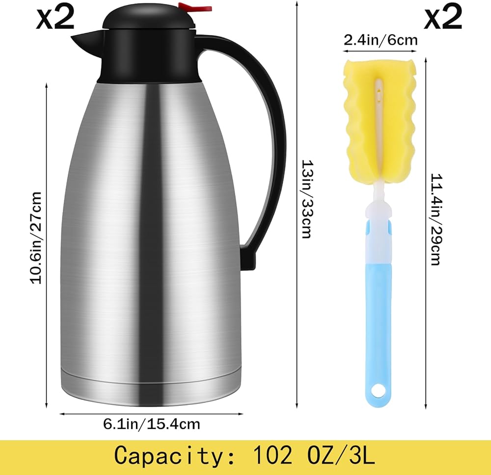 Thermal coffee carafe: bottom diameter is 6.1 inches/ 15.5 cm, height is 13 inches/ 33 cm, and 102 oz in capacity