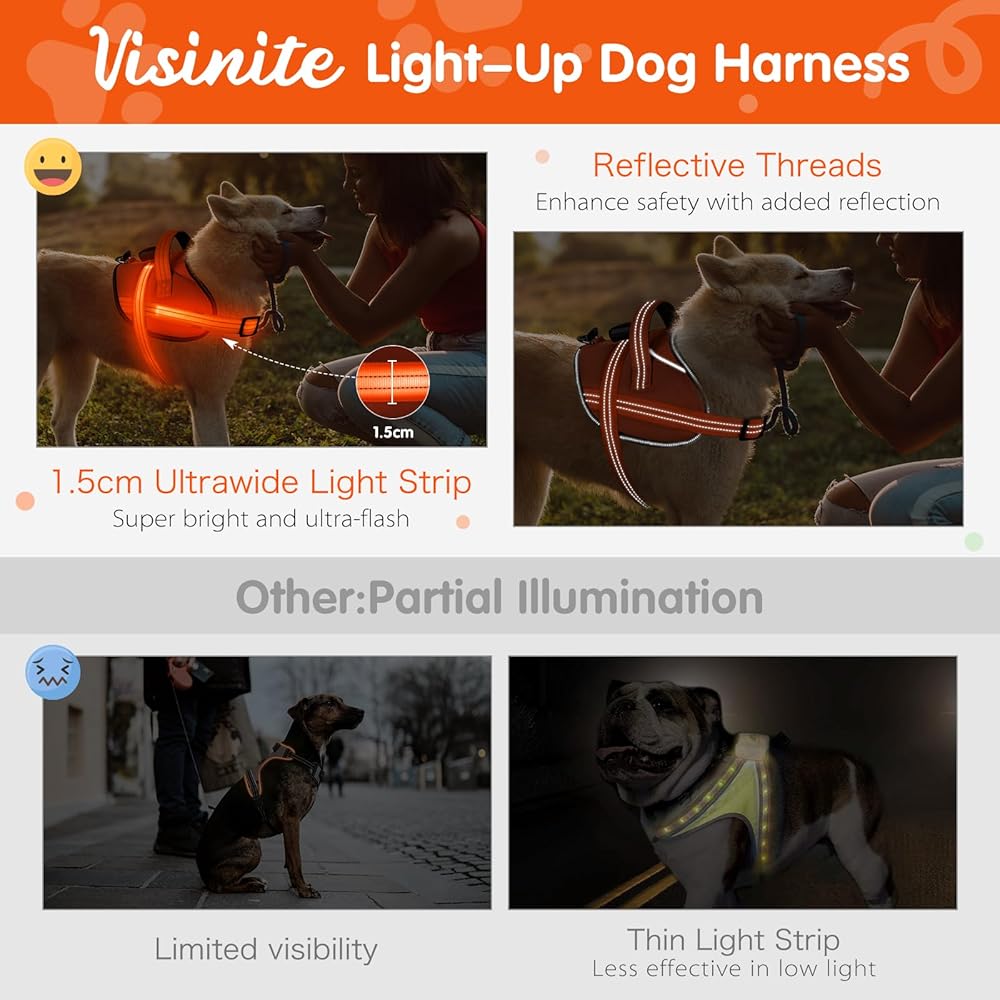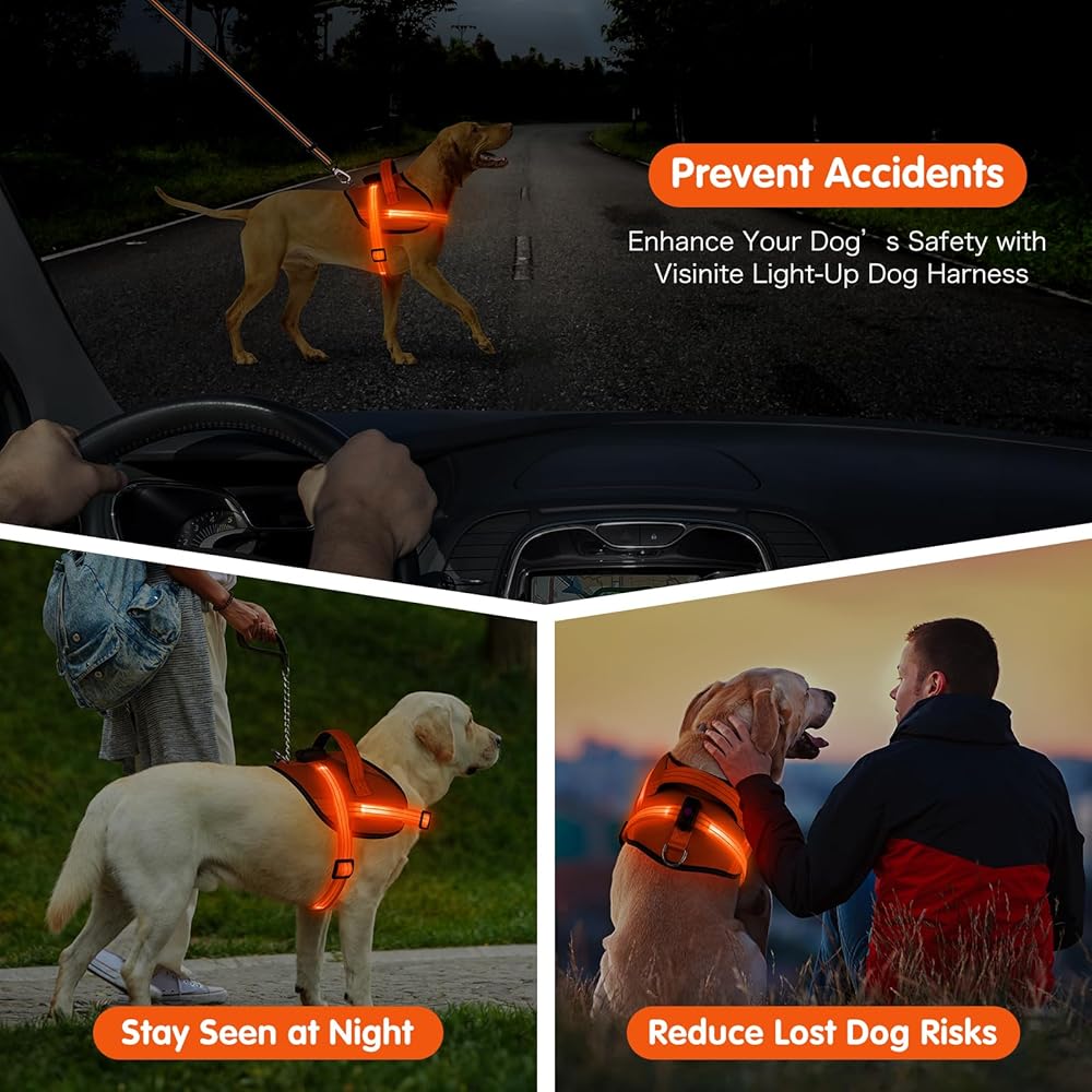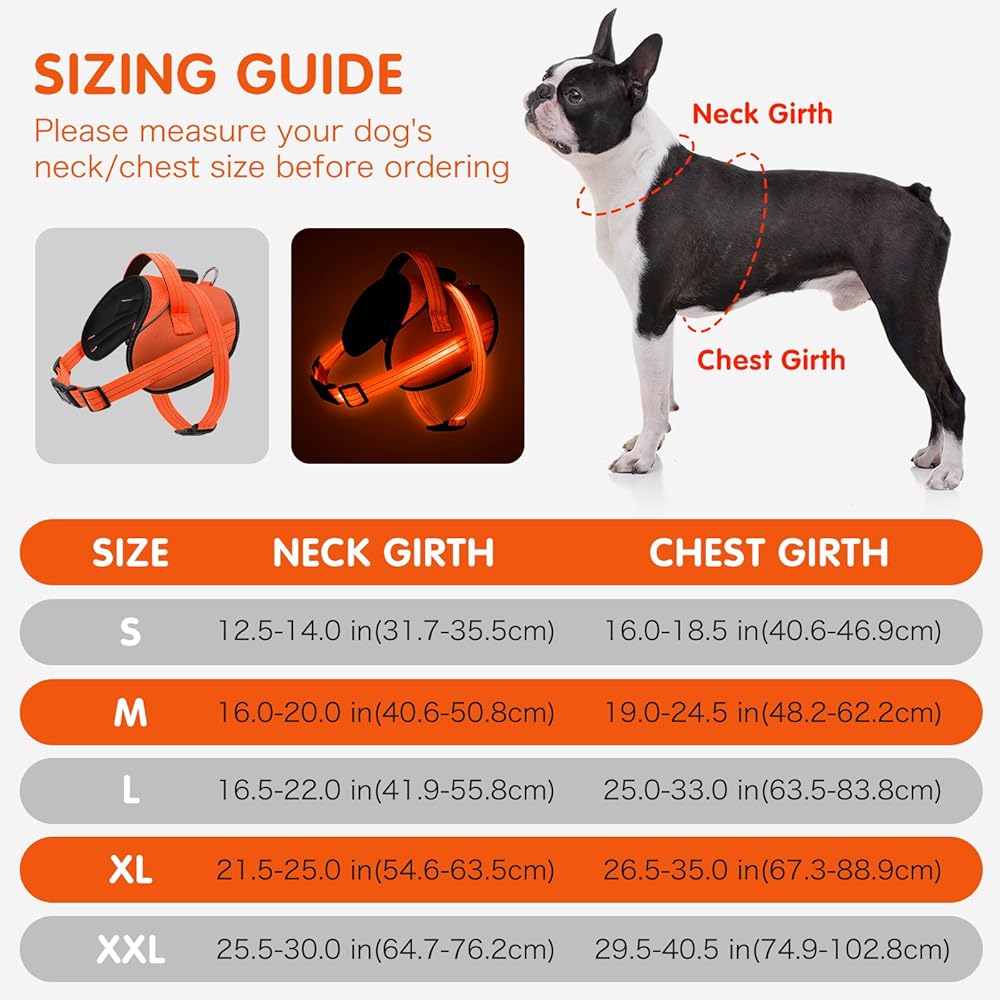 Light Up Dog Harness, No-Pull Led Dog Harness Rechargeable, Reflective Glow in The Dark Dog Vest Harness, Adjustable & Comfort Padded Lighted Dog Harness for Safety Night Walking (Orange, M)