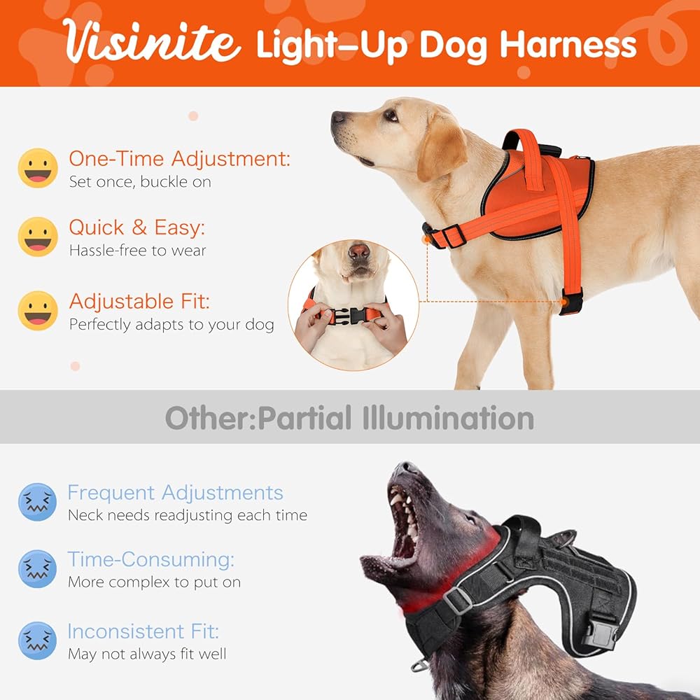 Quick & Effortless On/Off with Perfect Fit: Designed for convenience, our light up dog vest includes two quick-release buckles for easy on/off and two adjustable straps to achieve a custom fit for any dog size. This led dog vest ensures both comfort and security without the hassle of over-the-head harnesses, making it a perfect dog light up harness for all activities.