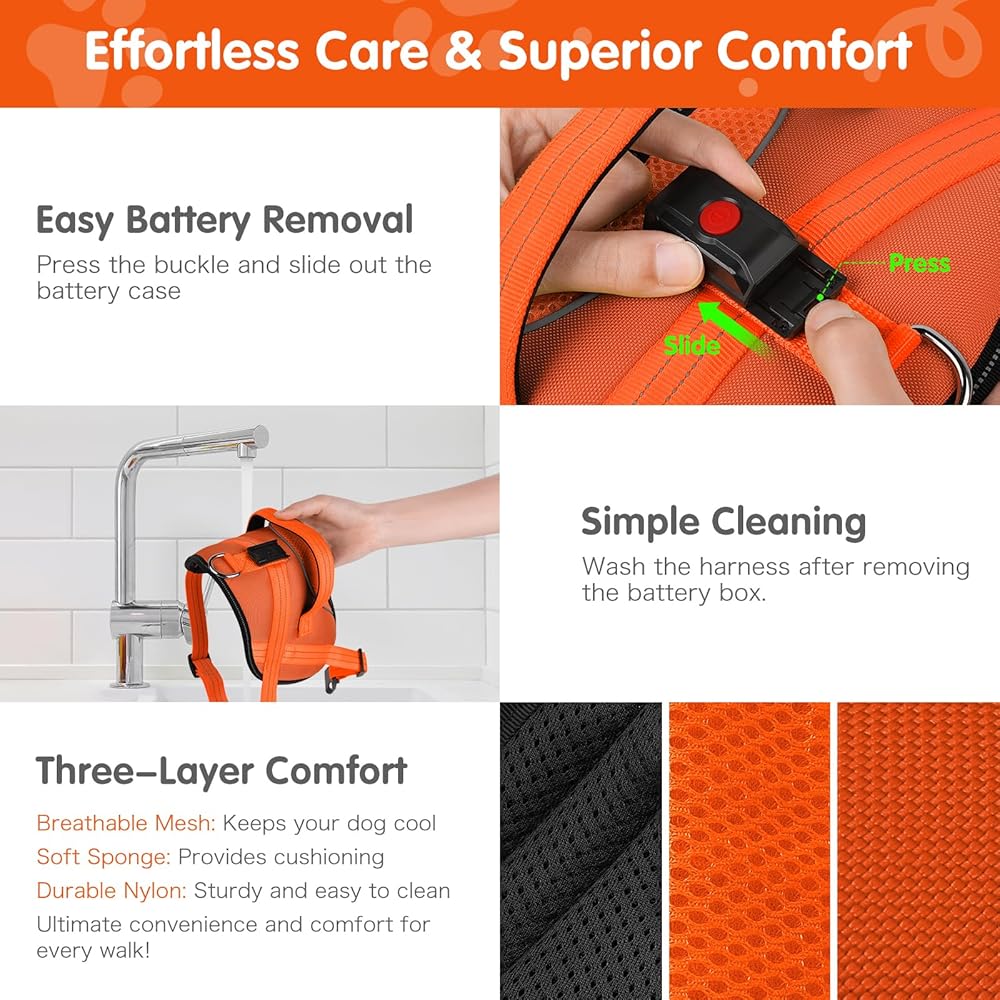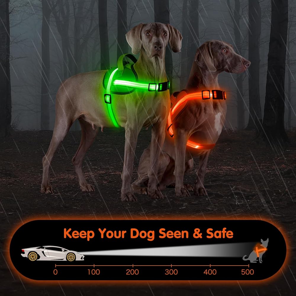 Unmatched 360-Degree Visibility: Featuring an ultra-bright 1.5cm LED light strip, our light up harness for dogs ensures your dog is visible from up to 500 feet away. Enhance their safety against potential dangers like cars, bicycles, or runners. This dog harness light keeps your dog safe during night walks, early morning outings, and low-light conditions, ensuring they're never out of sight.