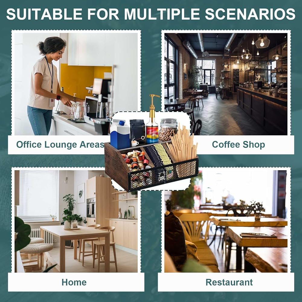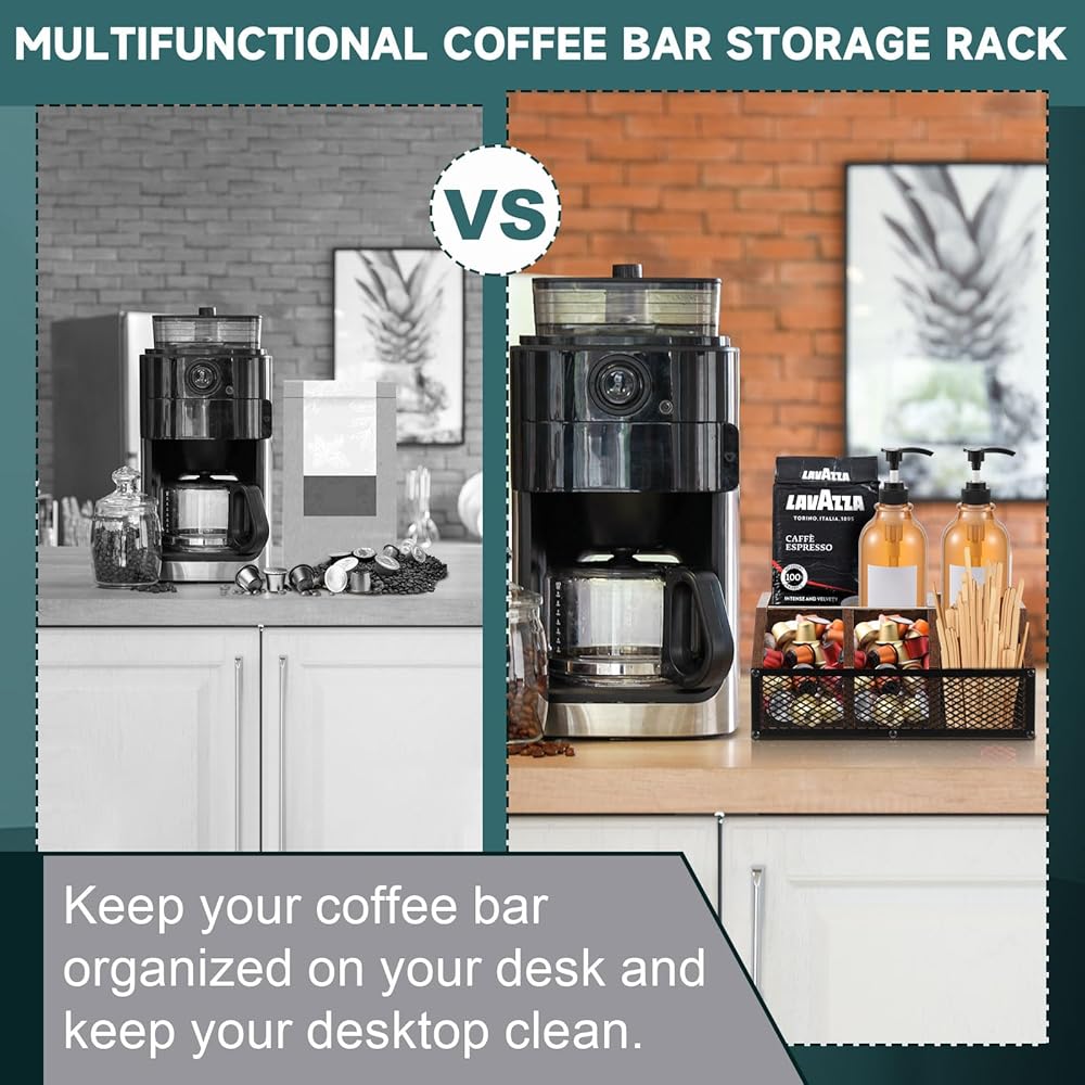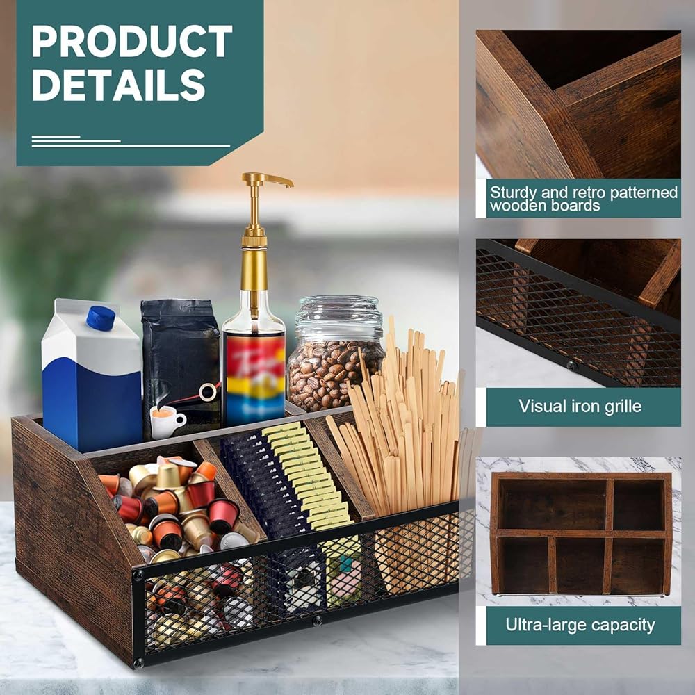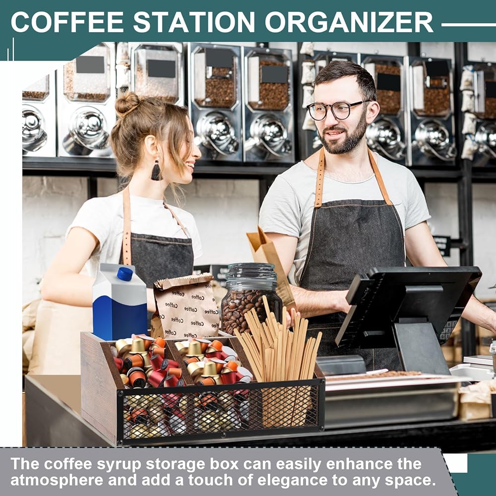 Made of solid, sturdy wood with the iron mesh design, durability meets elegance showered in the classic brown color that exudes an elegant charm. This coffee bar organizer for countertop combines both style and durability, ensuring a long lasting service for coffee lovers.