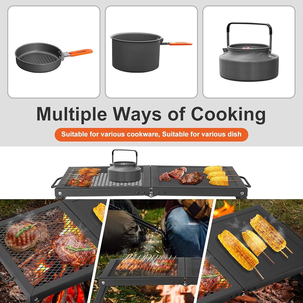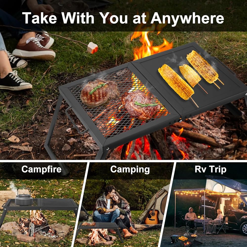 Sturdy Structure - Still use a tripod for campfire grilling? It's time to use the new folding campfire grill rack. Simple structure for easy operation, durable and heavy duty steel for long lasting and high temperature resistance, heavy loading for 13Lbs/ 6kg,you can cook a decent meal over on the fire!
