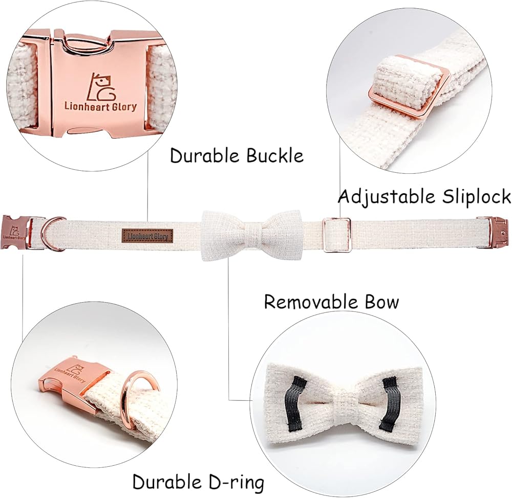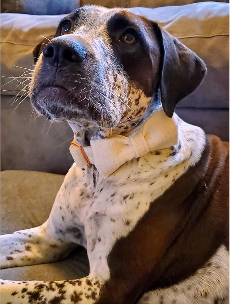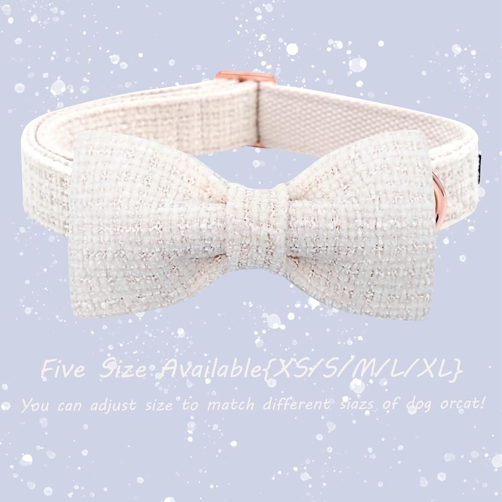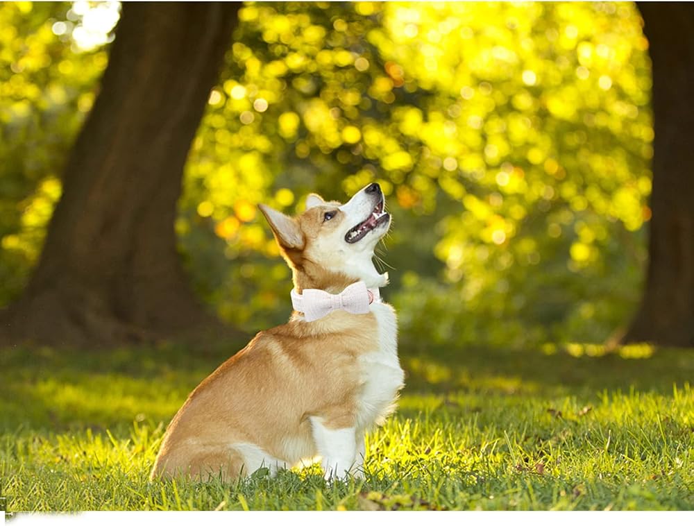 HANDMADE BOW: Each dog bowtie is attached to collar by using two elastic straps and bows all handmade. The elastic positioned each side of the bow prevents it from moving around on the collar. We do the double box stitch at all of the stress points for added strength.