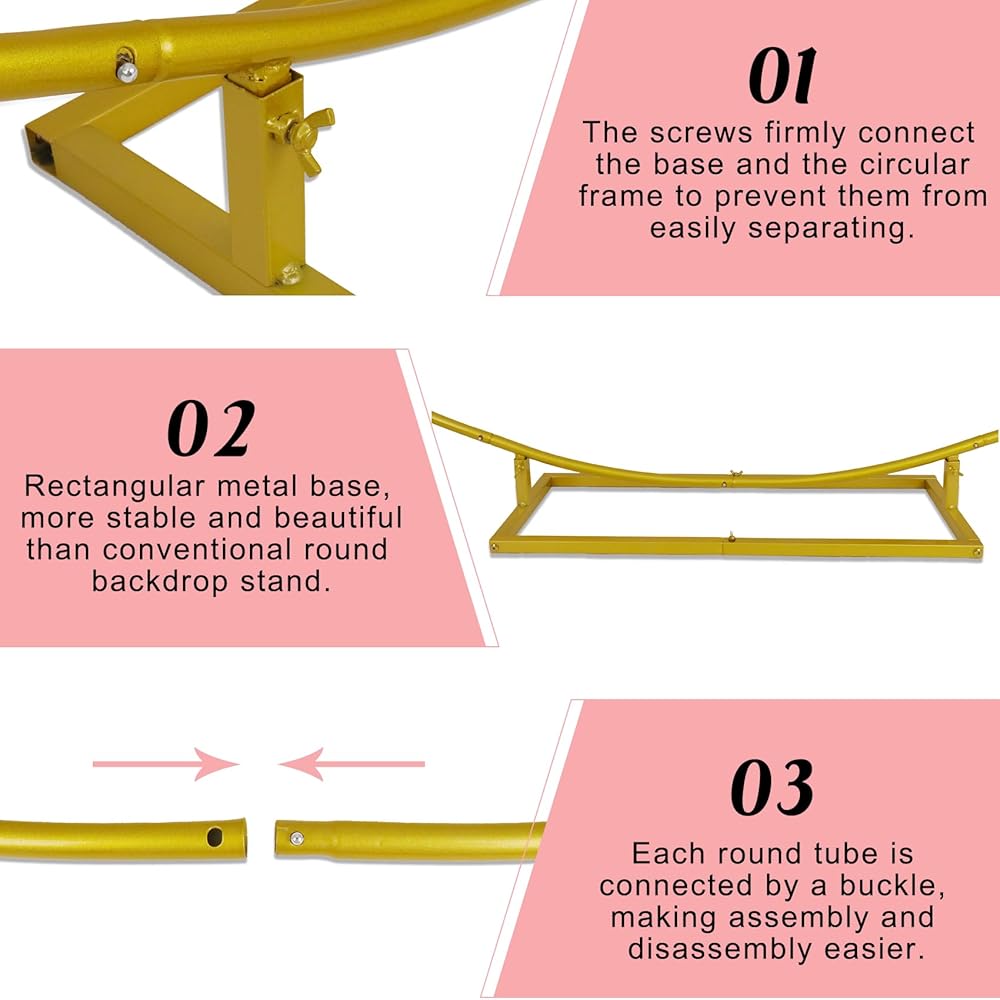 Design and Assembly-The round tube and big square base used in the round backdrop stand allow it to stand steadily without tipping over.During the installation process, only the buckle needs to be fastened, and the base needs to be tightened with screws.One person can easily complete assembly and disassembly.