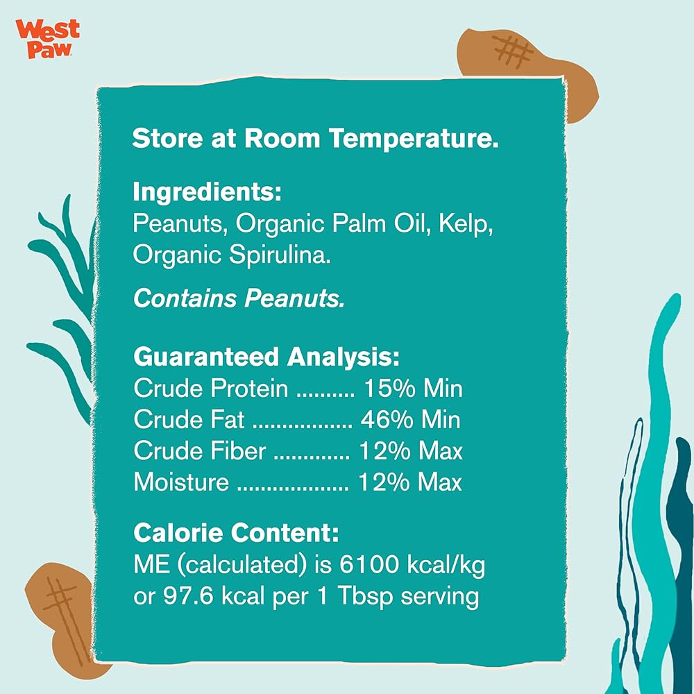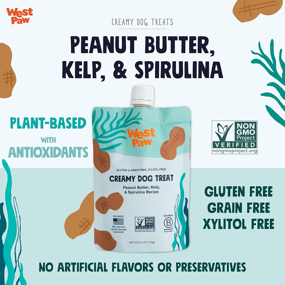 Simple, Plant-Based Nutrition Packed into a Mess-Free Pouch. Dogs love peanut butter, and West Paw loves treating it with a healthy, gourmet upgrade—like adding kelp and organic spirulina packed with antioxidants and nutritious vitamins and minerals. No sugar, no xylitol, no preservatives.