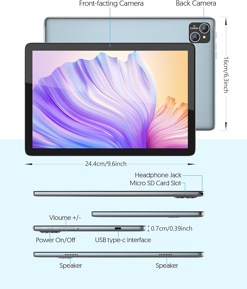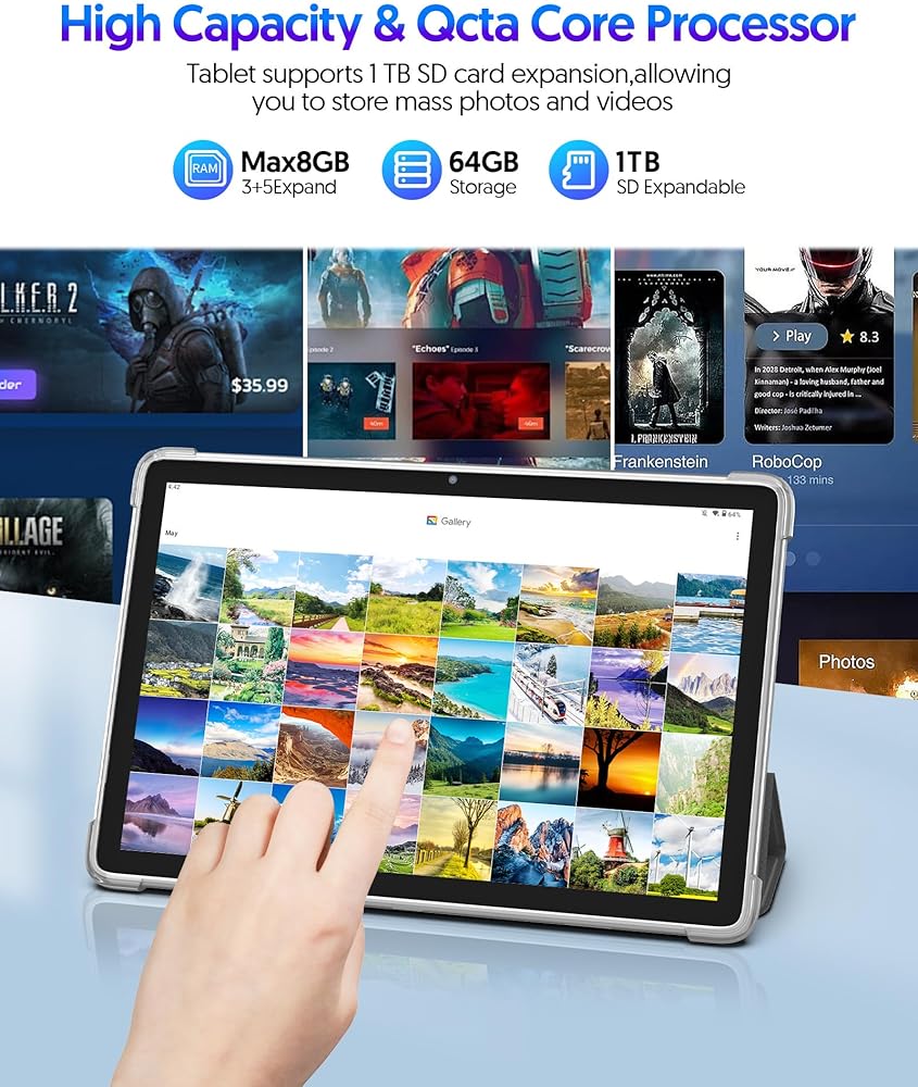 8GB RAM + 128GB ROM + 1TB EXPANSION - Android tablets equipped with a substantial 8GB(4GB+4GB expansion)of RAM and 128 GB of internal storage, this tablet pc handles large-scale applications and multitasking with ease. Whether you're streaming, or managing extensive data, it provides ample space and speed to meet all your needs without lag. What's more, tablets support up to 1TB micro sd card