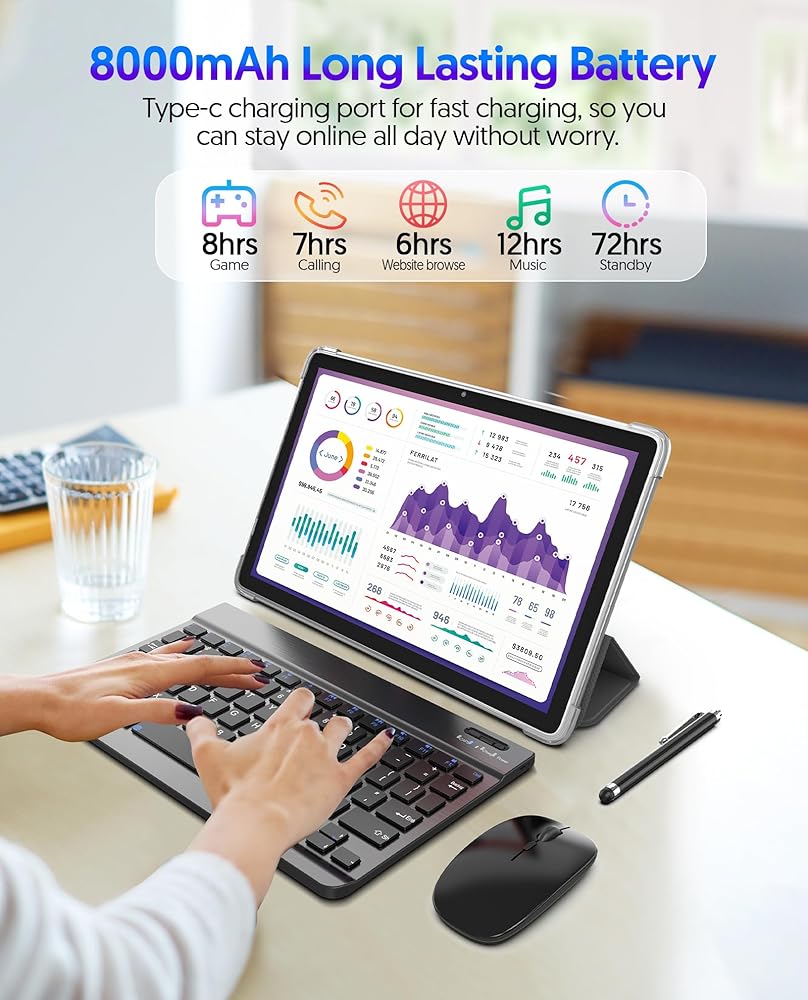 SPECIALIZED DESIGN - The tablet with keyboard supports both 5G/WIFI6, ensuring faster network speeds and enhanced stability. It also features a built-in Bluetooth 5.0 function, allowing seamless connections with keyboards, mice, headphones, and other Bluetooth devices, enabling a 2-in-1 laptop and tablet experience